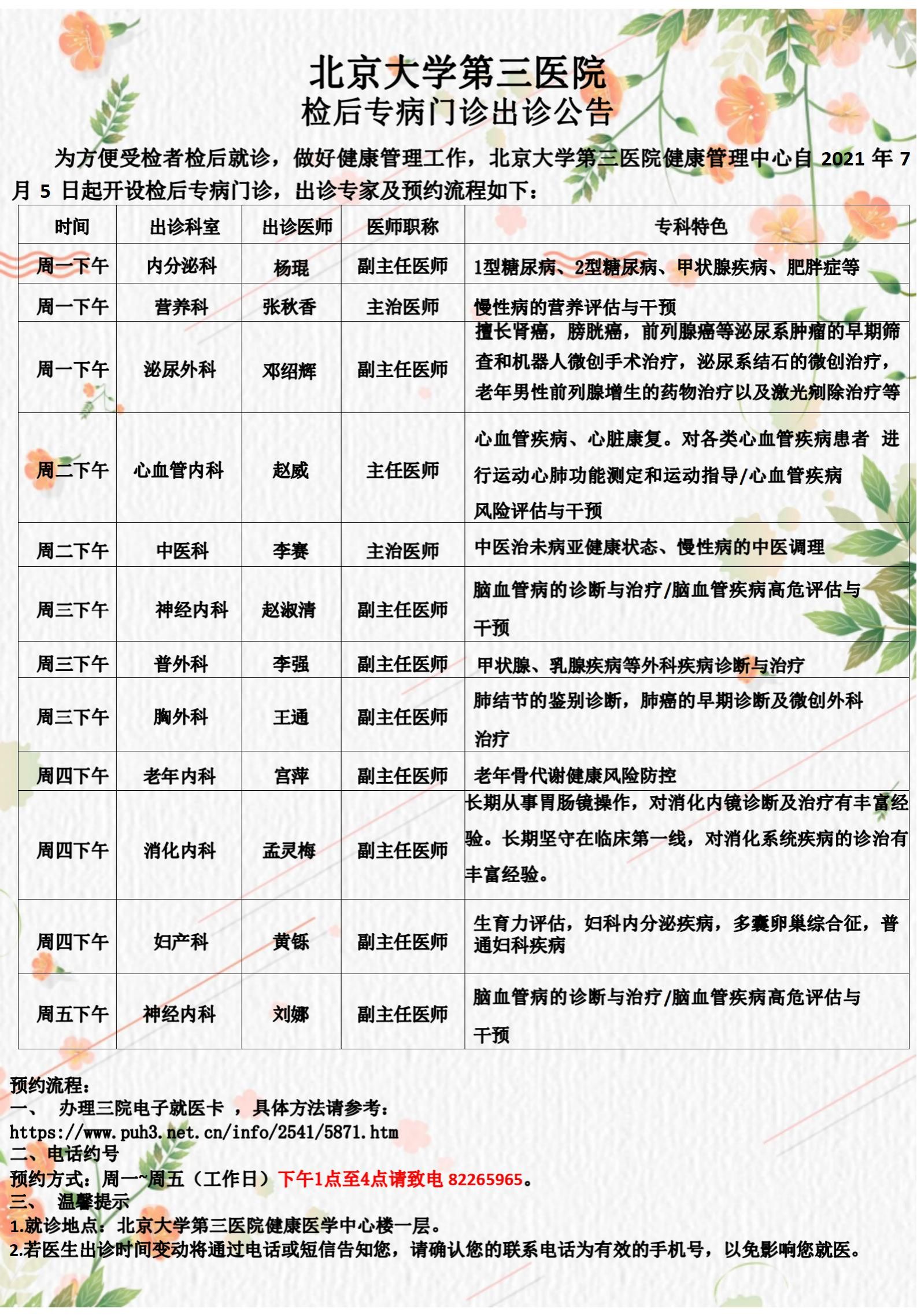 为方便受检者检后就诊,做好健康管理工作,北京大学第三医院健康管理中心与内分泌科、营养科、神经内科、心血管内科、普通外科、老年内科、妇产科、消化内科、中医科等临床重点专科联动联通,率先开设检后专病门诊。