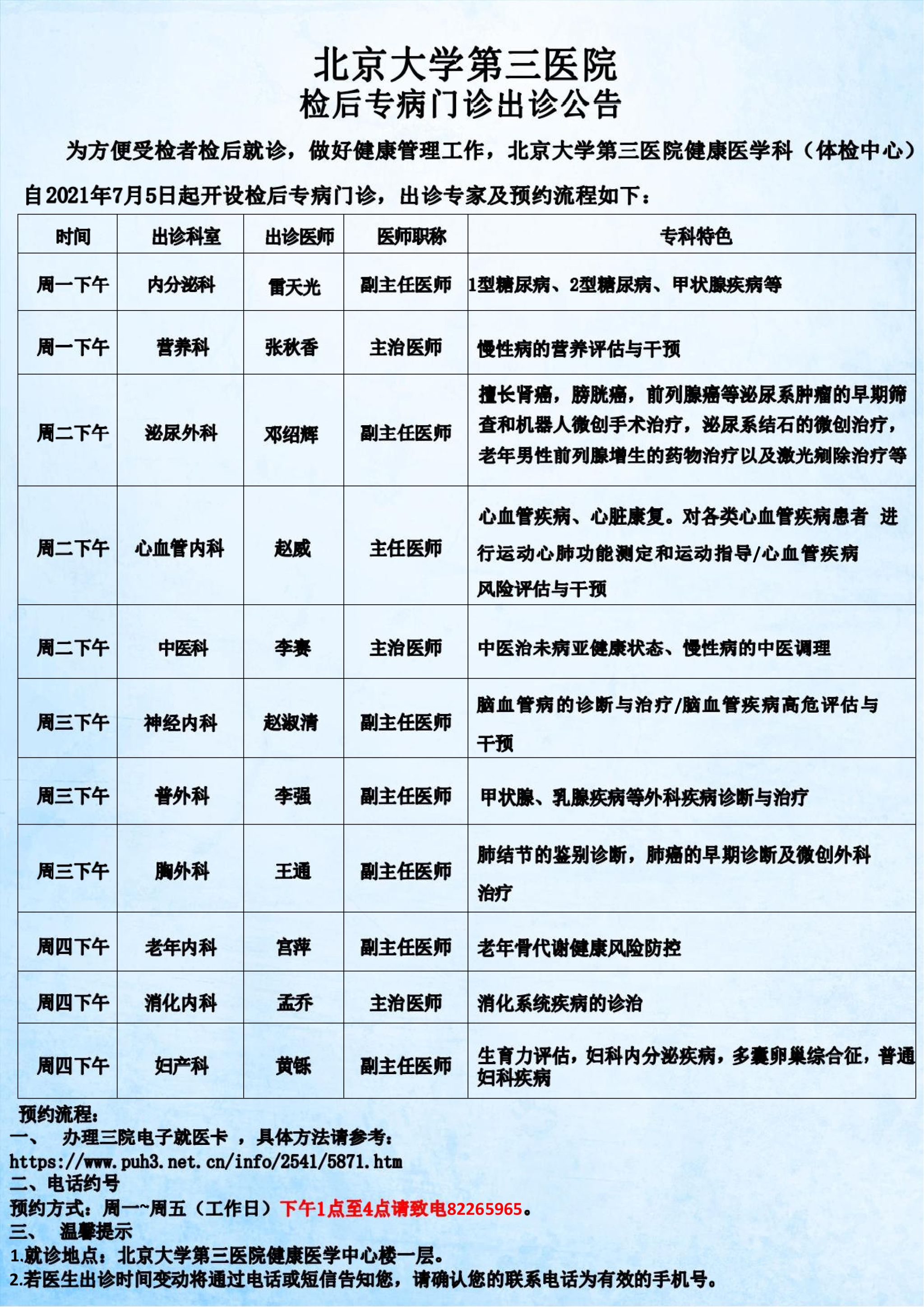 为方便受检者检后就诊,做好健康管理工作,北京大学第三医院健康医学科(体检中心)与内分泌科、营养科、神经内科、心血管内科、普通外科、老年内科、妇产科、消化内科、中医科等临床重点专科联动联通,率先开设检后专病门诊。
