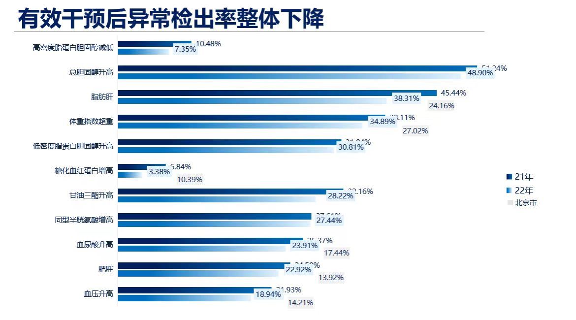 通过健康管理团队系统化、数据化的健康管理模式,实现员工体检报名、预约的“便捷性”,医疗健康宣教的“普及性”和员工医疗服务的“专业性”,充分提升员工在健康需求上的获得感和幸福感。通过有效干预后,2022年度员工健康体检异常检出率较2021年度整体明显下降。