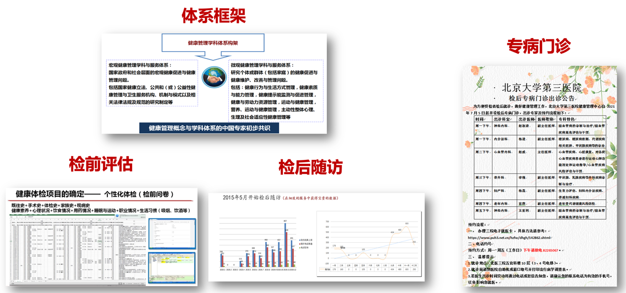 基于上述背景,北京大学第三医院依托特色学科优势,交叉融合开展多学科合作,通过人才培养与引进、设备设施投入和空间拓展等多方面促进健康管理学科的创新发展。在业内率先将运动评估与干预应用于健康体检与管理的日常业务当中,创立了行之有效、可推广、可复制的常设制度和工作机制。运用科学管理方法,形成具有我院特色的健康管理学科建设模式;打造健康管理-院内各优势学科-临床流行病-科研管理-数据平台为一体的科研协作共同体,切实推动科研创新及产出。