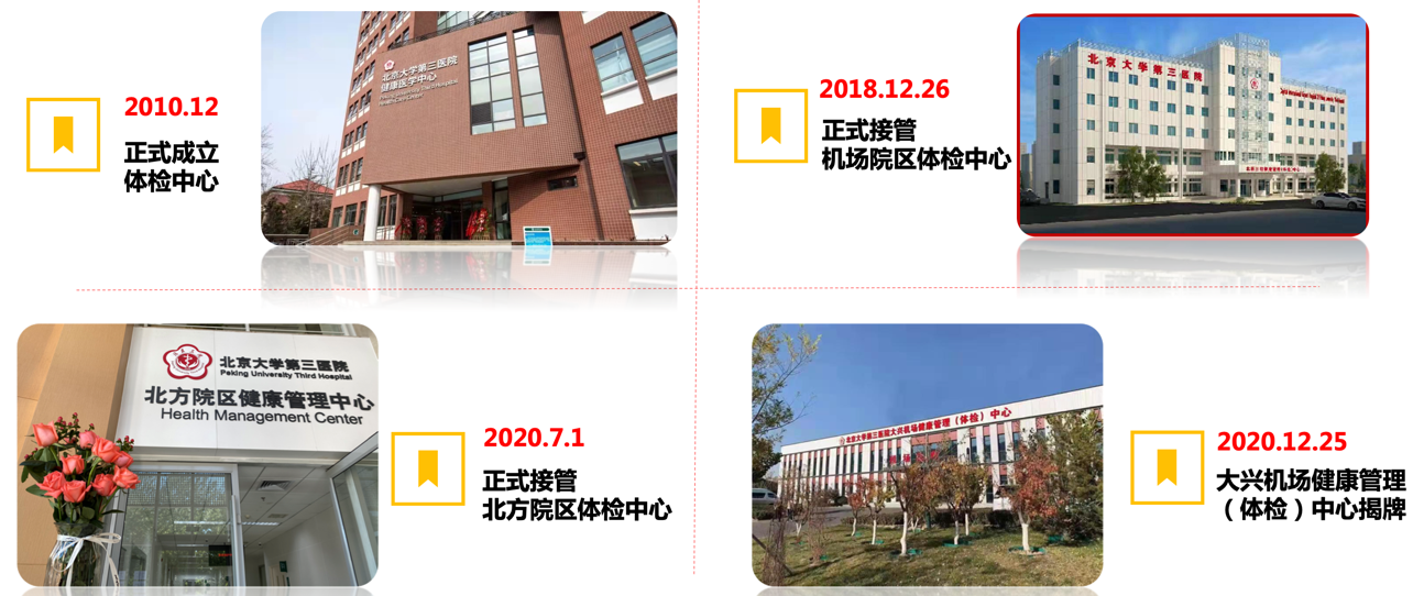 近年来,医院高度重视健康管理学科发展,在集团化发展的院区中逐一配置了健康管理中心。2018年12月和2020年7月,健康管理中心分别接管机场院区体检中心和北方院区体检中心;2020年12月,大兴机场健康管理(体检)中心揭牌。2022年3月,健康医学中心楼的启用是北医三院对接国家战略,将医教研防相结合,推进全生命周期健康管理的重要举措;高端医疗设备的配备,也为临床诊断及科学研究提供了新的支撑。
