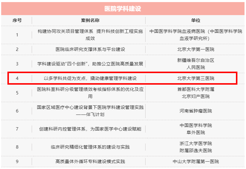 2023年2月18日,由国家卫健委建设和继续教育中心及现代医院管理能力建设专家委员会共同举办的“2022年度中国现代医院管理典型案例评选”活动结果正式揭晓,北京大学第三医院健康管理中心参选项目“以多学科共促为支点,撬动健康管理学科建设”荣登典型案例榜单。