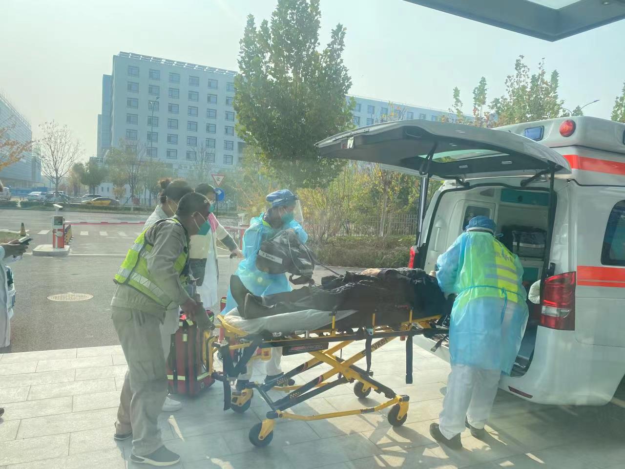 10分钟之内AOC机场急救人员及时赶到,抓住抢救患者的“接力棒”,迅速投入到转运的“战斗”中。他们娴熟地与健康管理中心医护人员进行完交接,做好监测、持续吸氧、开放静脉…平稳、快速地将刘先生就近护送到具备进一步救治能力的医院实施手术治疗。