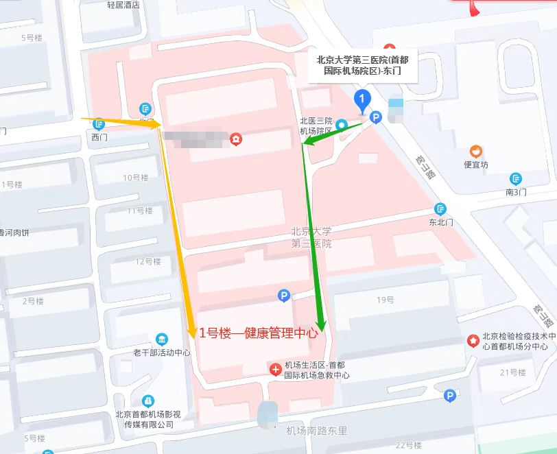 首都国际机场院区健康管理中心从机场南路东里乙3楼1号旧址,搬迁至机场院区1号楼一、二层,个人预约电话:010-64581188转5006,团检预约电话:010-64581188转4031、15611963880。