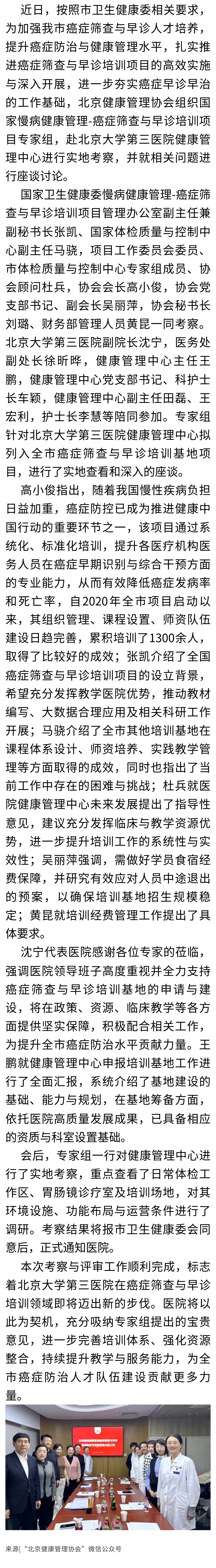北京健康管理协会组织国家慢病健康管理癌症筛查与早诊培训项目专家组赴北京大学第三医院健康管理中心考察调研