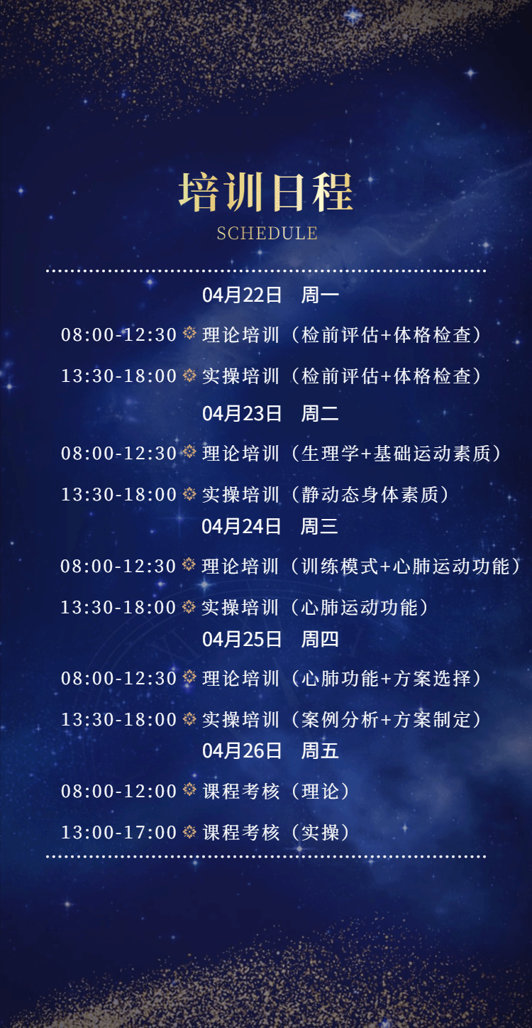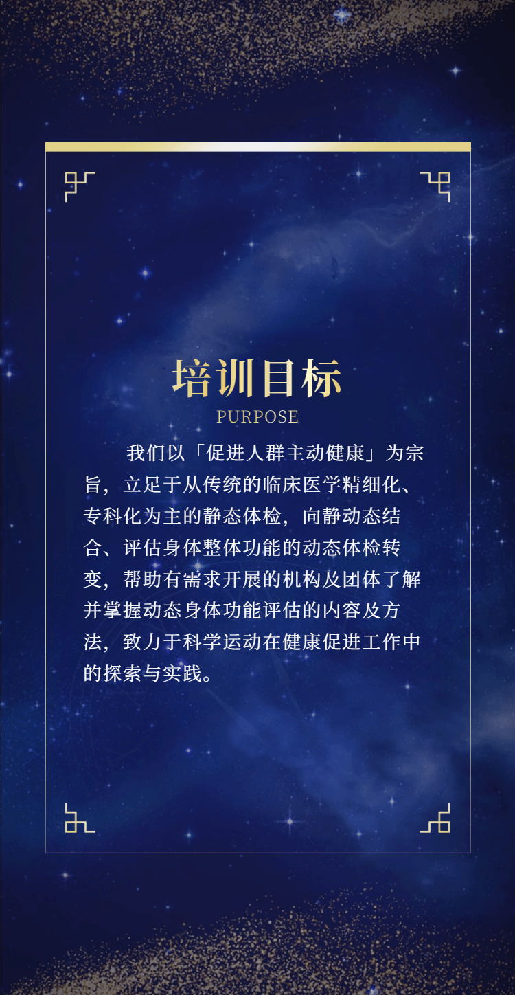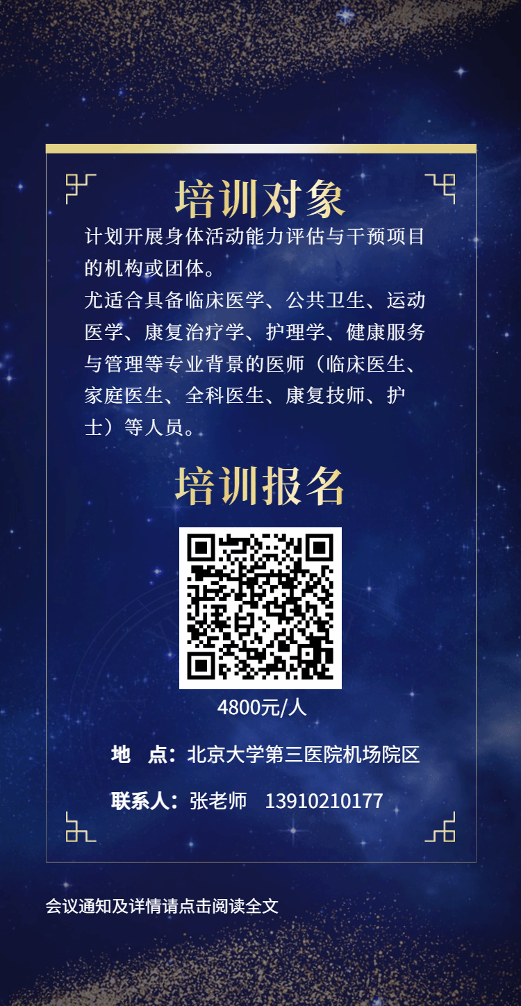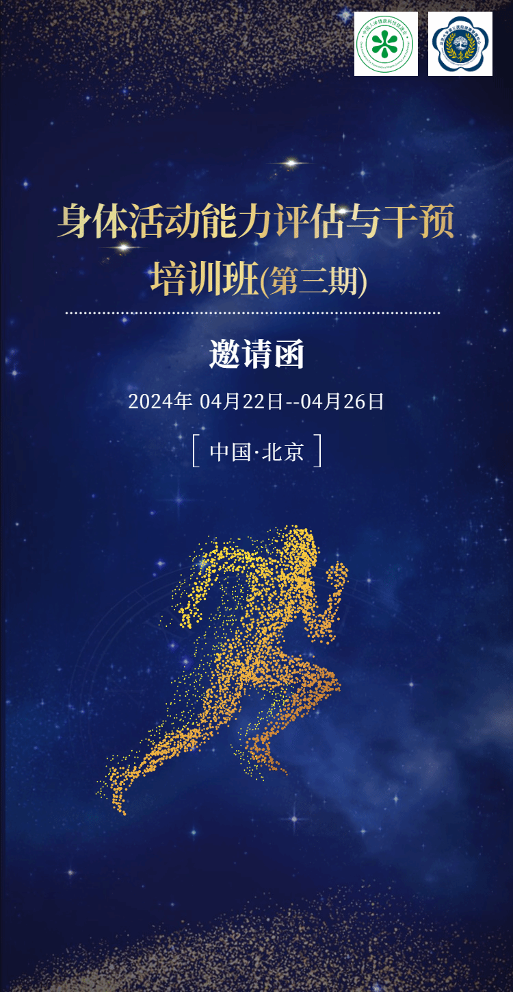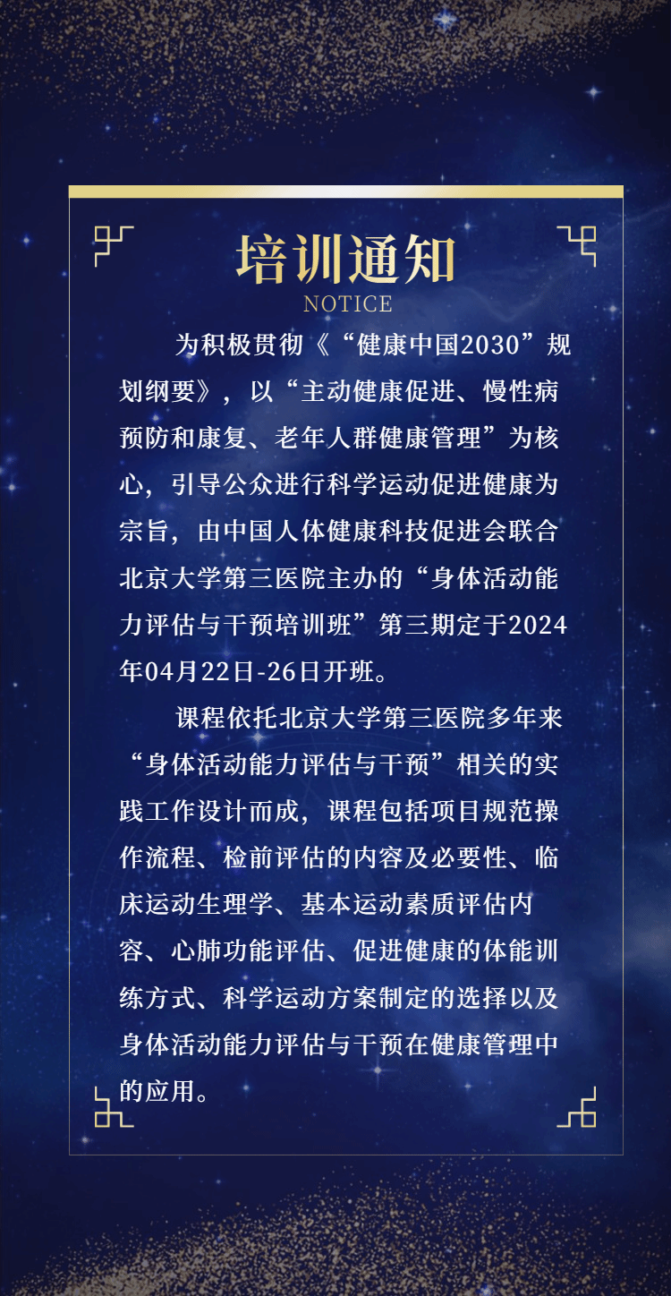 为积极贯彻《“健康中国2030”规划纲要》,以“主动健康促进、慢性病预防和康复、老年人群健康管理”为核心,引导公众进行科学运动促进健康为宗旨,由中国人体健康科技促进会联合北京大学第三医院主办的“身体活动能力评估与干预培训班”第三期定于2024年04月22日—26日开班。