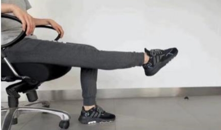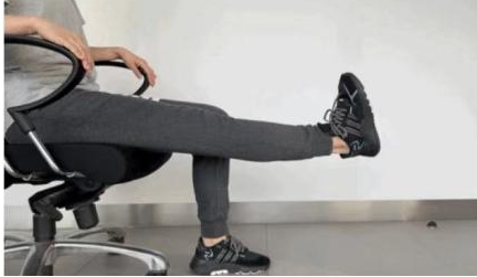 动作1:坐在椅子上,抬起一条腿,与地面平行。脚板向下压直,停留3秒,再将脚板施压向身体方向回勾,保持3秒。这个动作重复5次,做完左腿做右腿。
