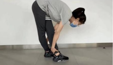 动作2:左右脚交叉站立,慢慢下压弯腰,双手垂直向下贴近脚踝,注意要慢慢来,以免肌肉拉伤,停留5秒,然后起身。