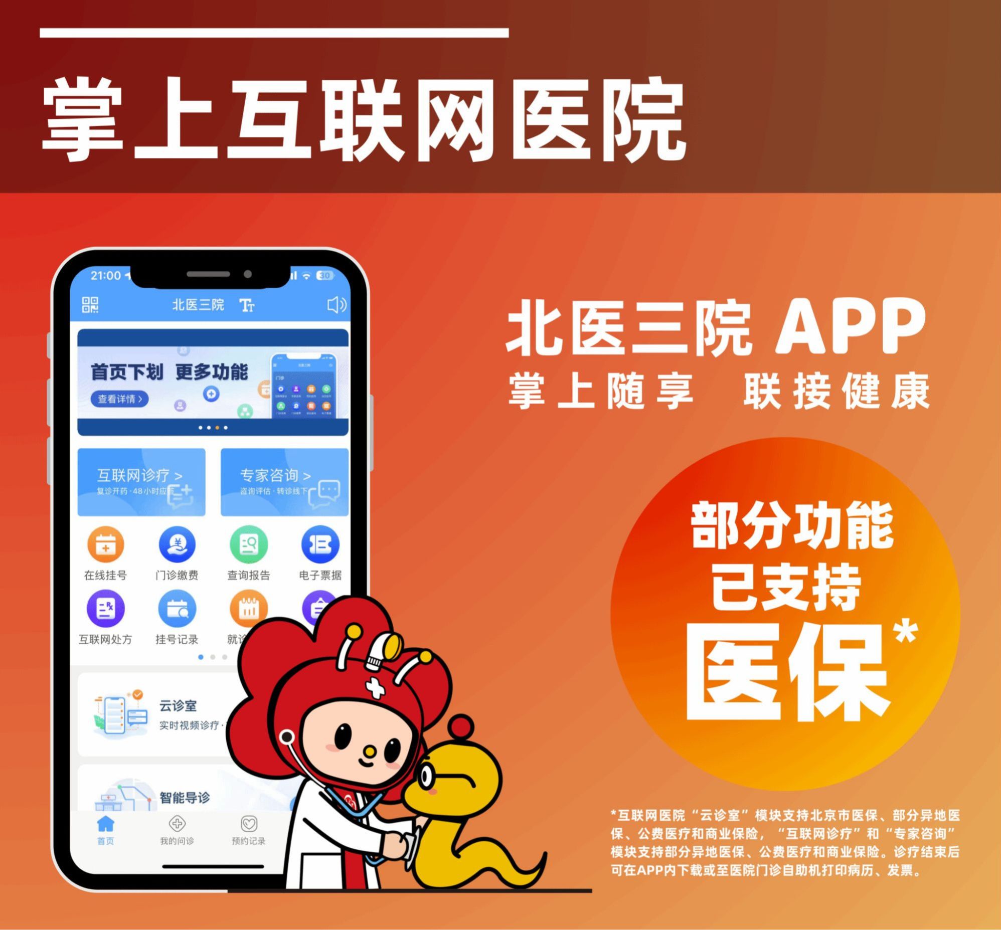 “北医三院”APP目前为患者提供专家咨询、互联网诊疗、云诊室视频问诊、免费义诊、预约挂号、预问诊、开具处方、开具检查单、药品配送、门诊缴费、查询报告、云胶片、就诊记录、挂号记录、电子票据、药学咨询、护理团队咨询、病理报告咨询、多学科联合门诊申请预约等功能,涵盖诊前、诊中、诊后的线上线下一体化服务,患者可根据自身需要选择使用相应功能。如果出现急危重症、或原有疾病病情变化、加重等不适宜互联网诊疗的情况将不予接诊,...