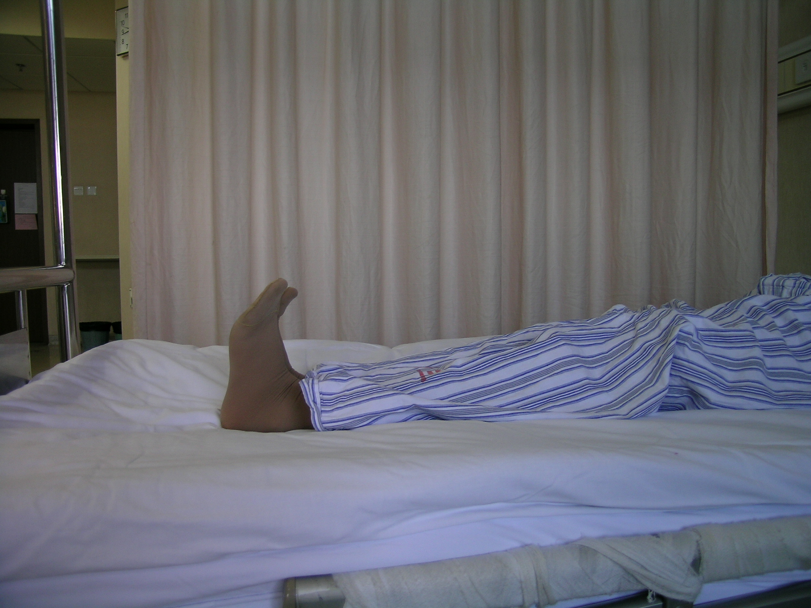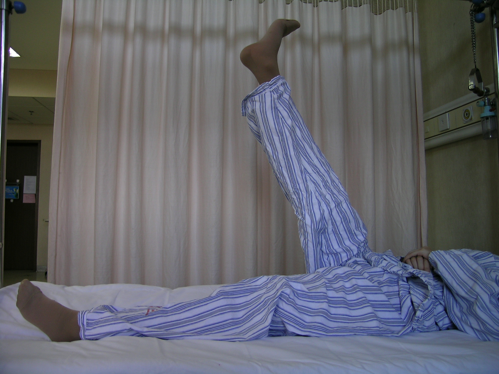 1.术后功能锻炼:术后提倡尽早活动,术后当天可进行踝泵练习(见图1),以促进下肢血液循环,降低下肢血栓的发生几率;术后第2日开始进行直腿抬高练习(见图2),慢抬慢降,角度大于70°,每天2组,每组3-5次,以锻炼股四头肌的力量。术后坚持踝泵练习和直腿抬高练习。