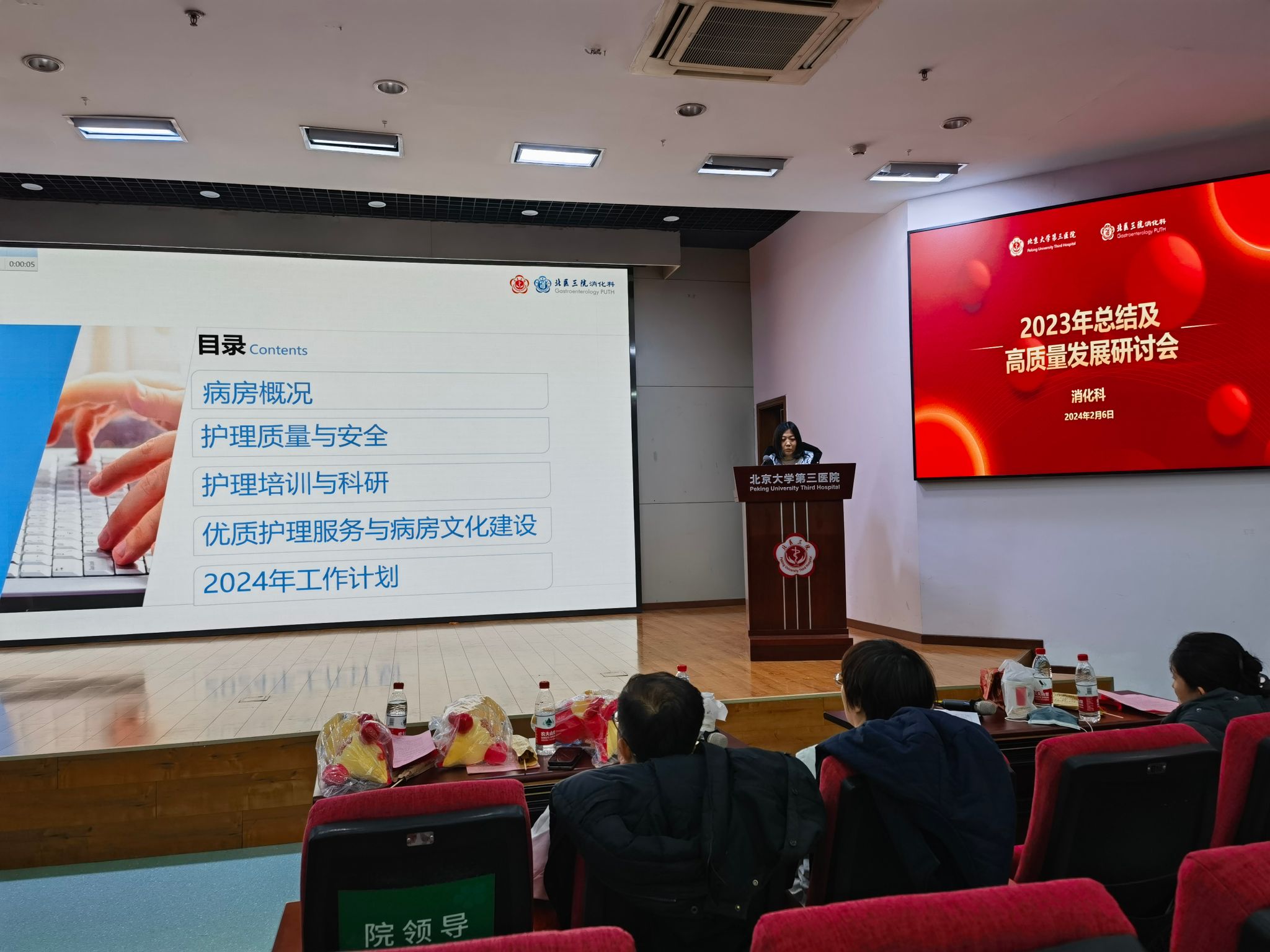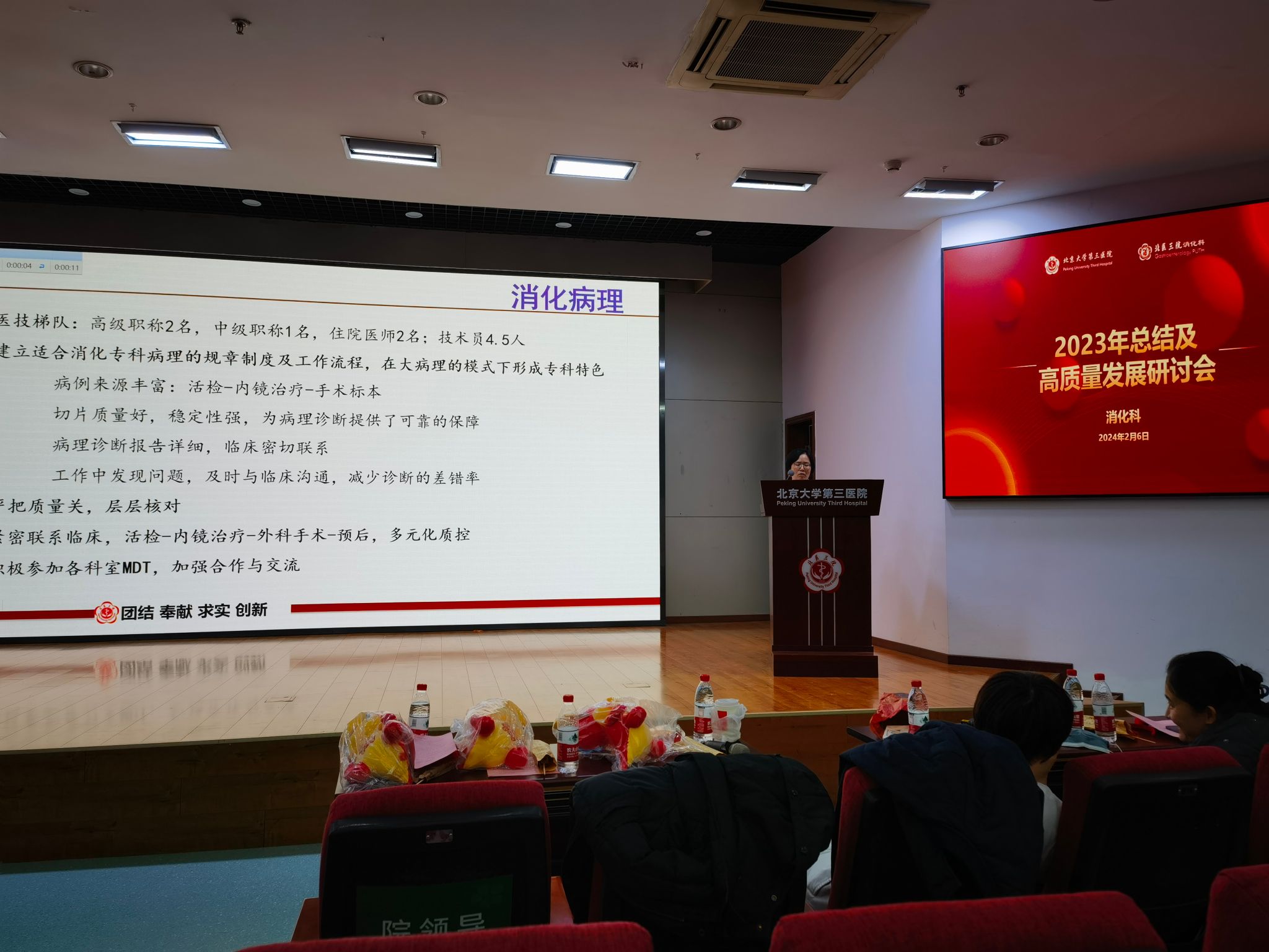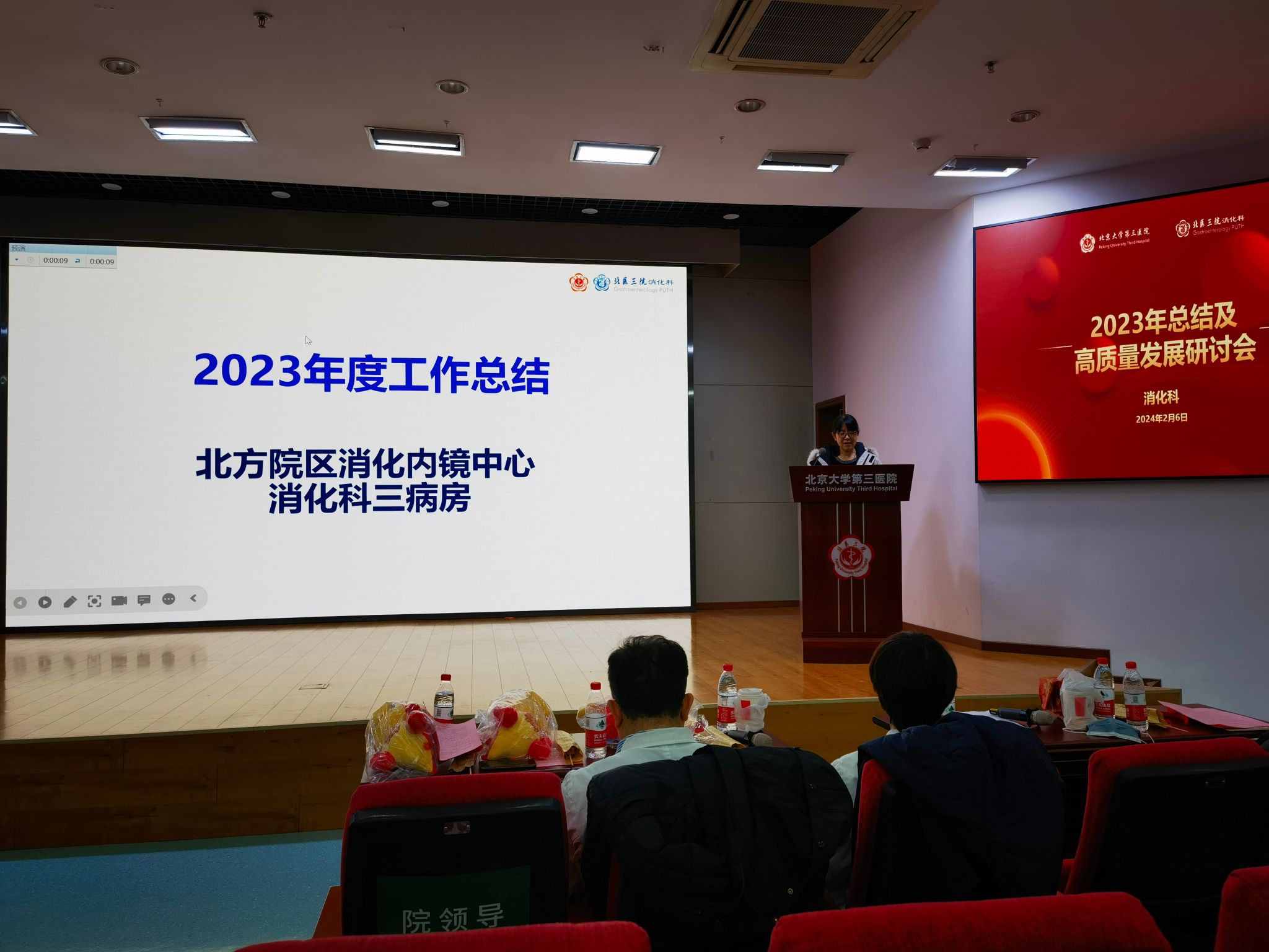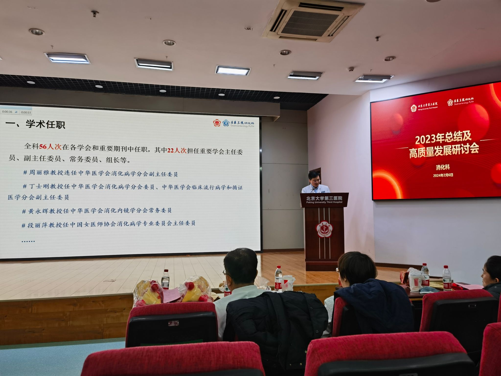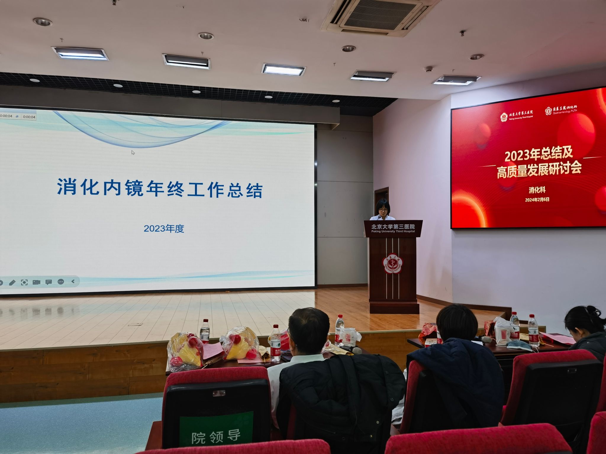 研讨会开场,由消化科丁士刚主任带领的科室核心组成员,与大内科主任段丽萍教授一同给全体职工拜年,感谢大家在 2023 年的辛苦付出,也祝愿消化科全体职工甲辰龙年工作顺利、身体健康、新的一年有新的发展。