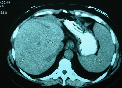 肝脏CT:考虑肝血管瘤,肝右叶血管弧形移位。