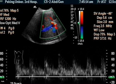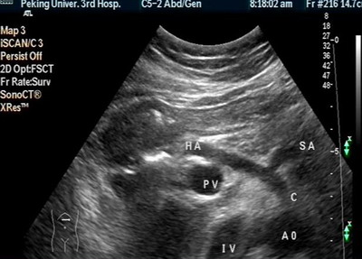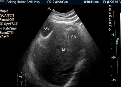 肝脏B超:右肝内及肝尾叶可见巨大强回声结节,9.3×8.8cm,边界欠清,后方回声增强。CDI:肿物周边可见肝动静脉绕行及肿物内门静脉穿行,无明显压迫现象。脾厚5.0cm肋下3.2cm脾门处脾静脉宽0.8cm