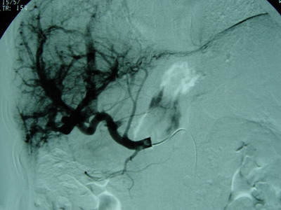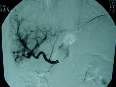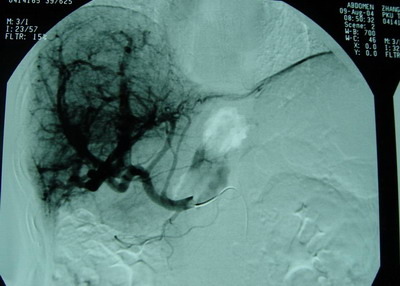 肝动脉、肠系膜上动脉、脾动脉造影见肝总动脉明显增粗,动脉期肝动脉及其分支显影良好,动脉早期可见门静脉显影,呈明显肝动脉—门静脉双轨征。肝实质期未见肿瘤染色。肠系膜上动脉间接门静脉显影,门静脉主干显影。门静脉血流方向为双向。可见胃底曲张血管逆行显影。
