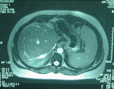 肝MRI:肝右叶异常信号――符合血管瘤肝形态,血管改变——考虑发育异常。