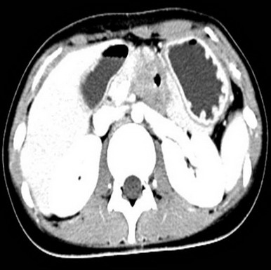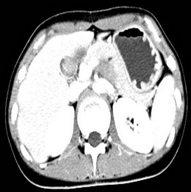腹膜后占位,性质待定,十二指肠局部穿透伴炎性包裹,十二指肠水平段梗阻,近端积液扩张,肝小囊肿(胰体后下方见不规则软组织密度影,大小约48mm*33mm,其内见气体密度影,增强扫描静脉期肿块明显不均匀强化,CT值约30HUPS 86HUCE,病变与十二指肠水平段、升段及胰腺分界不清,十二指肠水平段明显变窄,胃及近端十二指肠明显积液扩张。)