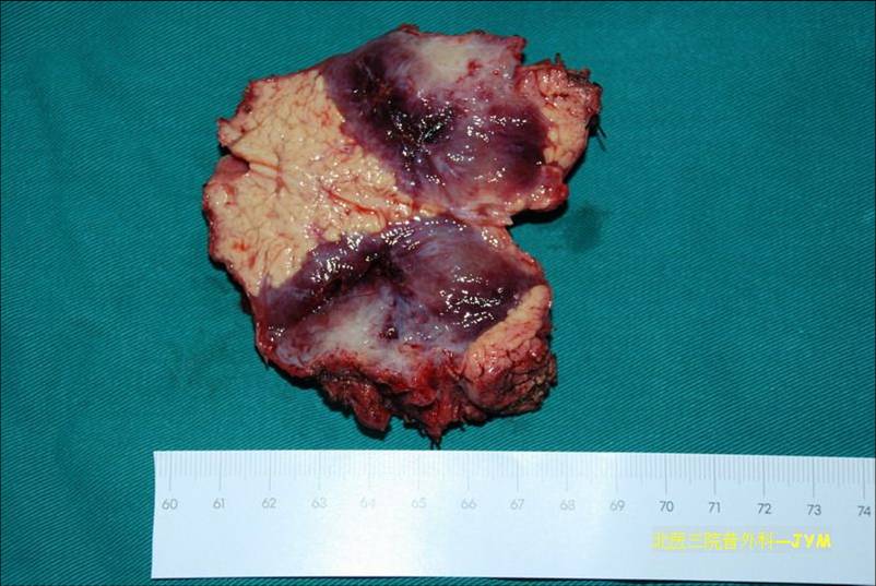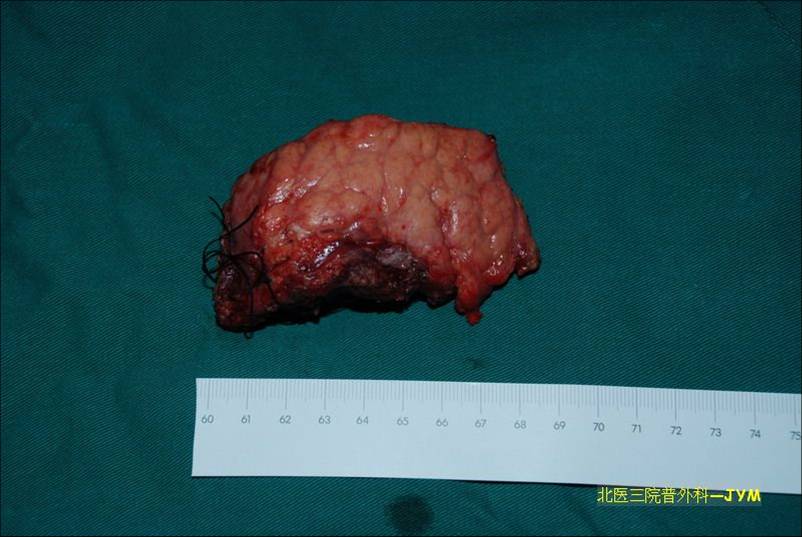 胰肠吻合口,十二指肠空肠吻合口各留置引流管,胰体,深部肿瘤(约5cm)送病理。