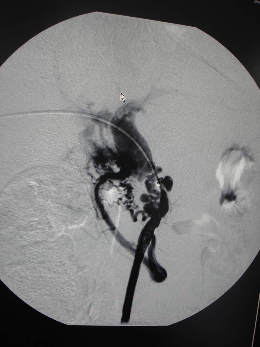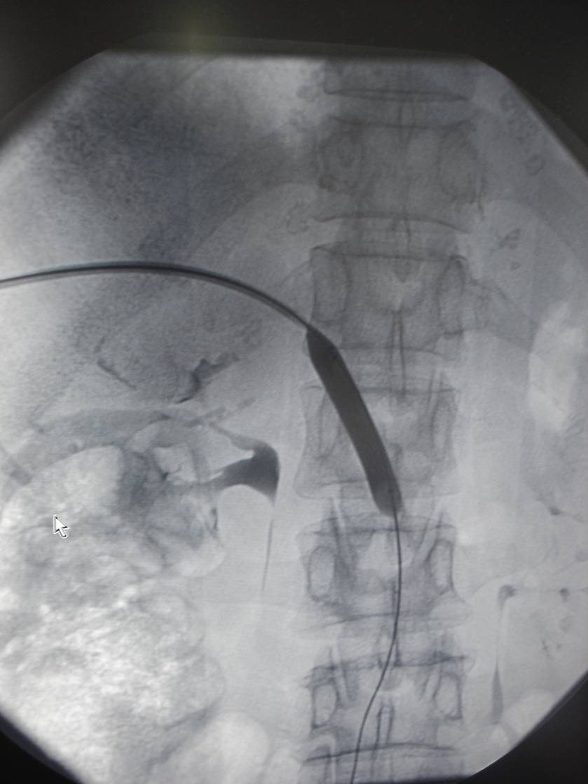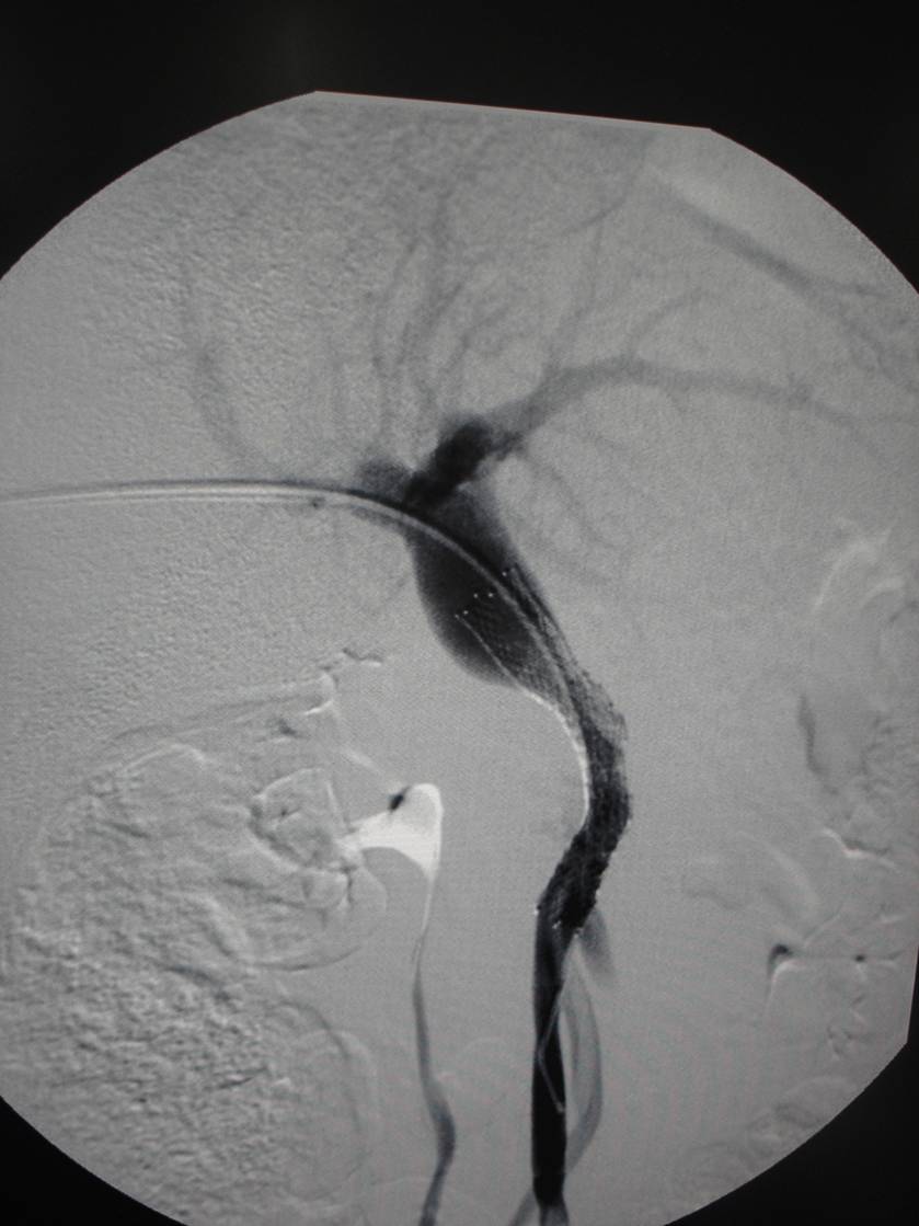 经全科讨论并请普外科、介入科会诊后,考虑慢性胰腺炎所致门静脉狭窄、区域性门脉高压,周围迂曲的侧枝循环导致胆肠吻合口处多发血管扩张并出血。患者转入介入科门静脉造影见门脉远端重度狭窄,用球囊扩张狭窄段,并自肠系膜上静脉及门静脉植入支架。