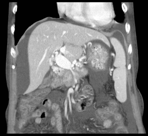 胰腺CT:胰头部病变—性质待查1慢性炎症性?2胰头癌?门静脉局限性狭窄—原因待查炎症所致?肿瘤侵犯?门静脉血栓,下腔静脉局限性狭窄---布-加综合症?大小肠水肿—肠淤血性?胸腹腔大量积液,胆囊缺如—术后改变。