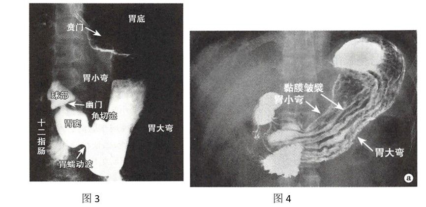 那么什么是“造影检查”呢?造影检查是基于X线成像及造影剂的,普通的X线检查依靠人体自身组织的天然对比形成X线影像(比较常见的如胸片),对于缺乏自然对比的结构或器官(如胃肠等消化道),可将密度高于(或低于)该结构或器官的物质(造影剂/对比剂)引入器官内或其周围间隙,人为地使之产生密度差别而形成影像,此即“造影检查”。上消化道造影就是针对上消化道所进行的造影检查,打个比方,如果胃镜检查像是深入到胃内的彩色照片(图1图2),那么消化道造影就像是胃的黑白素描画作(图3图4),造影剂就是铅笔。如下图所示。本文主要简介一下临床比较广泛应用的上消化道双重对比造影。