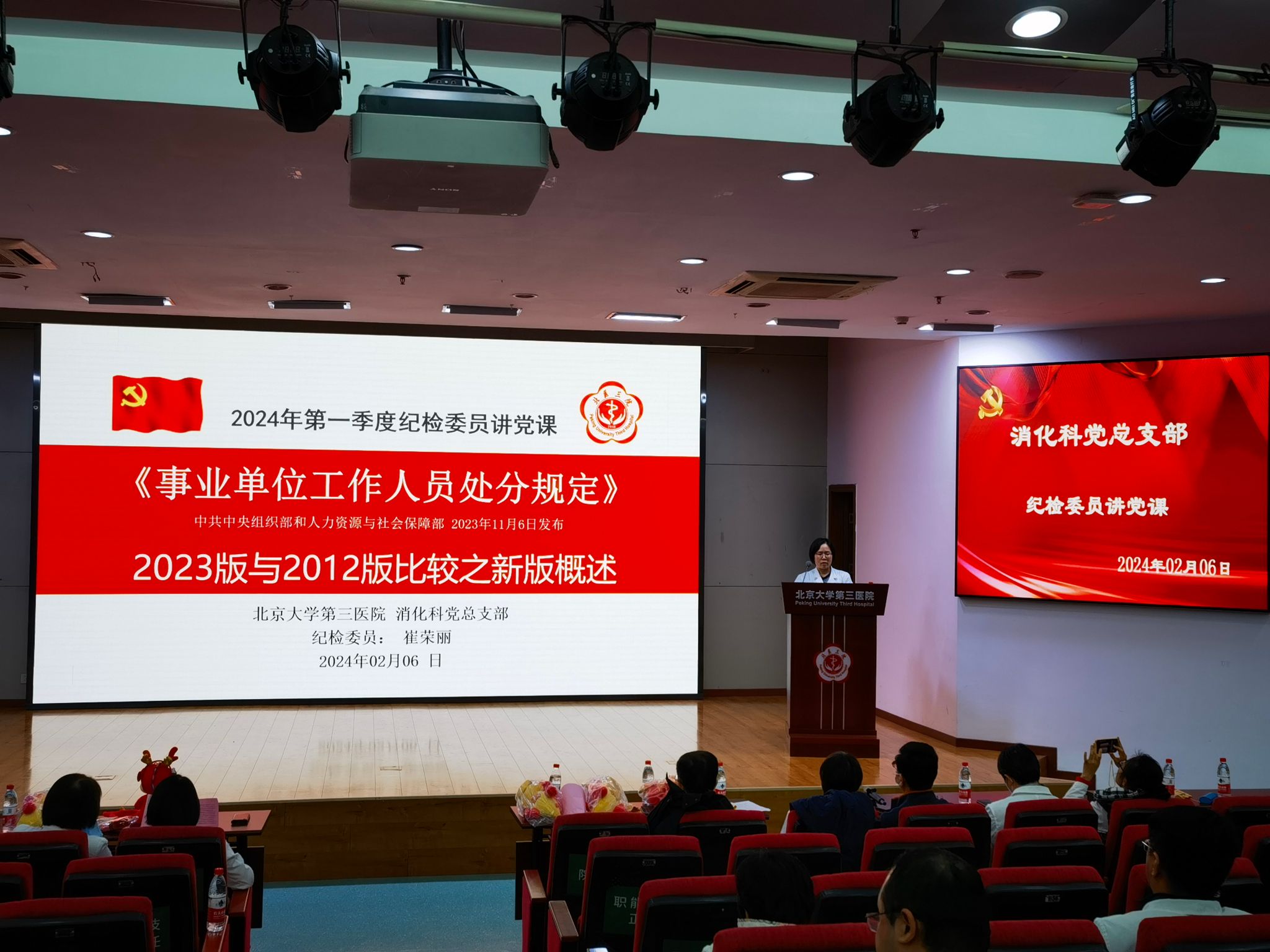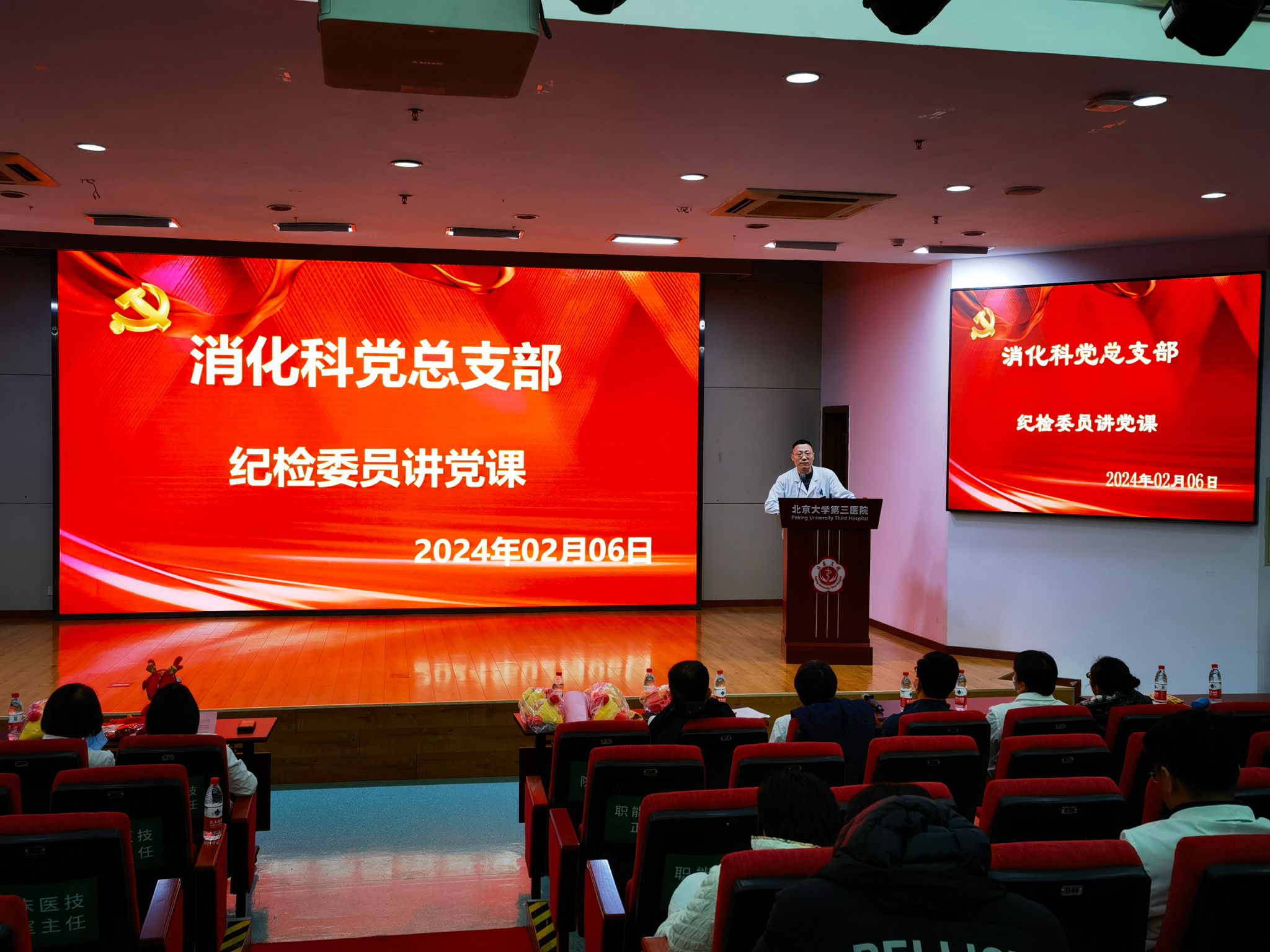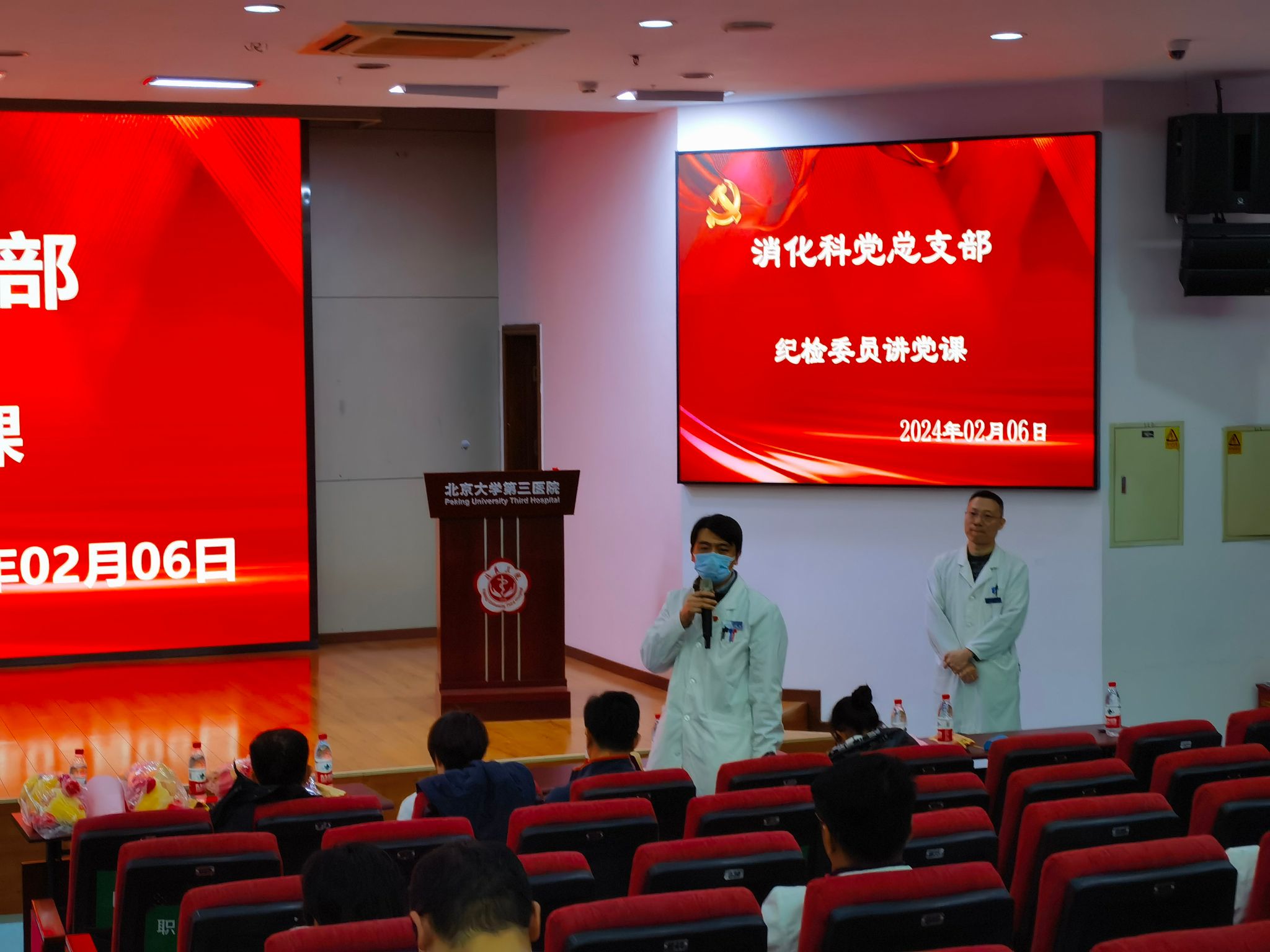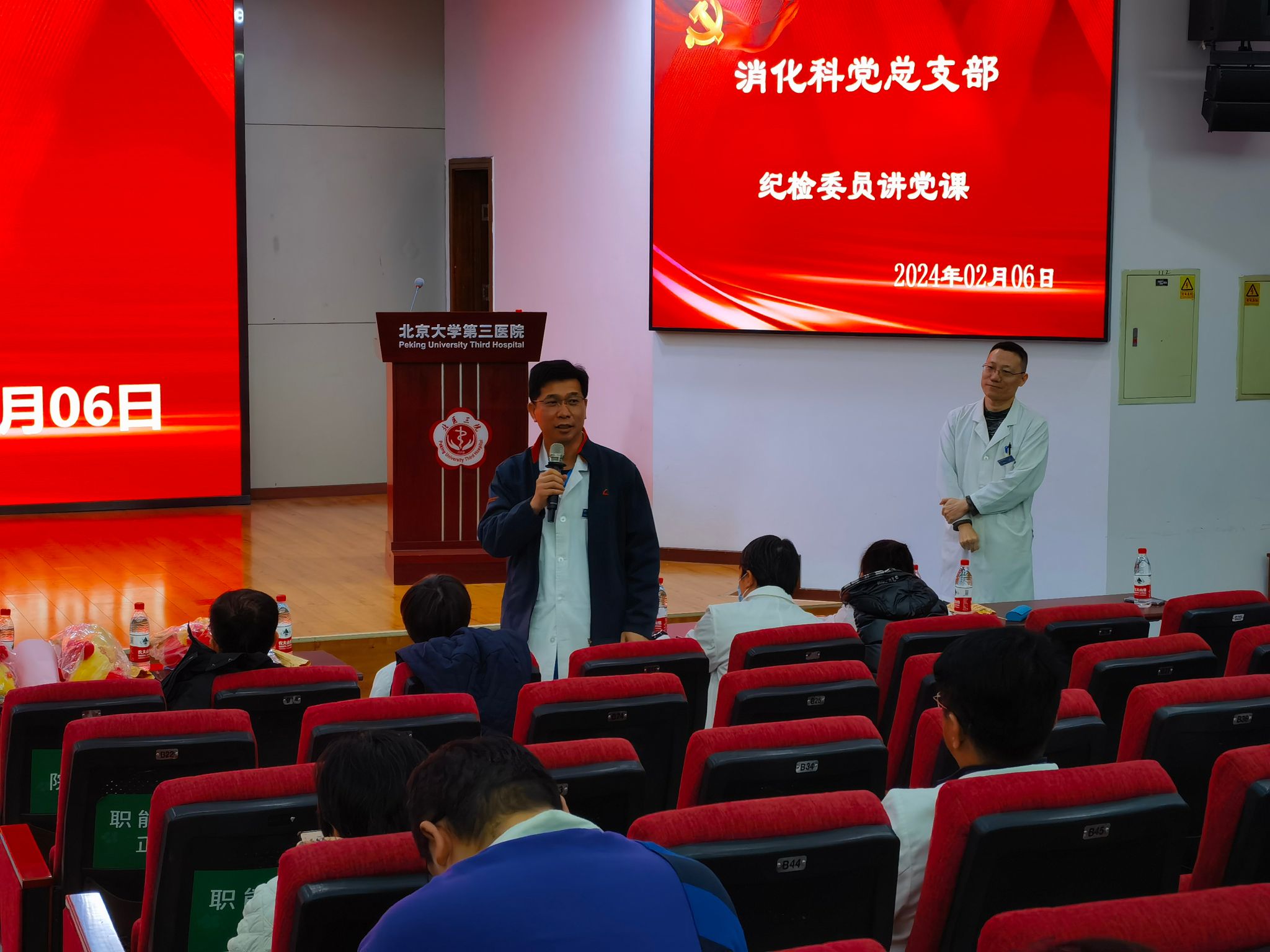 按照医院党委、纪委 2024 年“每季一课”活动要求,2024 年 2 月 6 日消化科党总支组织全体党员和全体职工在科学报告厅进行第一季度的党课学习,并邀请了医院纪委委员、呼吸与危重症医学科党支部书记、危重医学科主任周庆涛,病理科党支部书记、纪检委员武睿,监督检查室王慧婷进行现场督导。