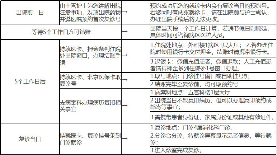 尊敬的患者,您好!为了您能顺利办理出院手续及进行术后首次复查,请您认真阅读此出院复查流程,顺利出院并按时复诊,北医三院消化科全体医护人员祝您早日康复!