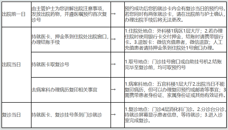尊敬的患者,您好!为了您能顺利办理出院手续及进行术后首次复查,请您认真阅读此出院复查流程,顺利出院并按时复诊,北医三院消化科全体医护人员祝您早日康复!