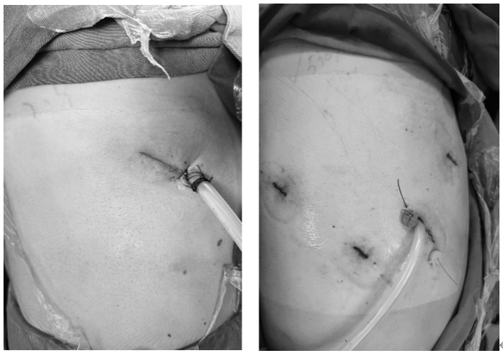纯单孔机器人肺叶切除术(左)对比常规四孔机器人手术(右)切口及引流管照片