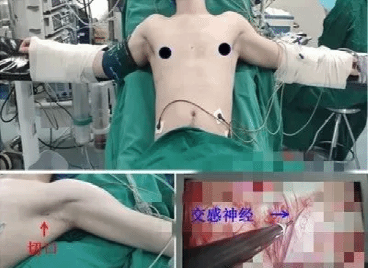 控制手部汗腺的交感神经位于胸椎旁的第4交感神经节处,只要将这节的交感神经切断,就可以达到手部不流汗的目的。如果想同时治疗腋汗,可以同时切断第4+5交感神经节。并不推荐第3交感神经切断以及头汗的治疗,并发症如代偿性多汗的发生率较高,临床并未开展。