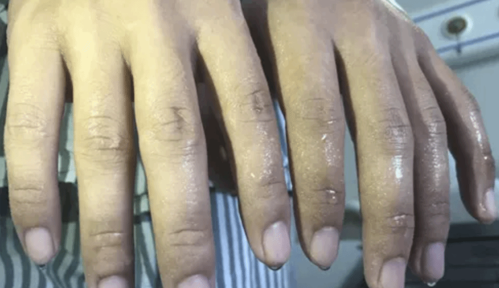 重度:手掌出汗时呈滴注状。