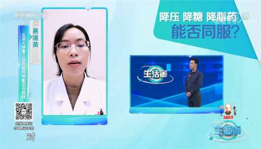 ——(2021年11 月 8 日CCTV《生活圈》栏目) 药剂科易湛苗药师科普降压药、降糖药、降脂药是否 可以同时服用。 链接地址:https://tv.cctv.com/2021/11/08/VIDEgiP1BmIxykc08QyKAPPt211108.shtml
