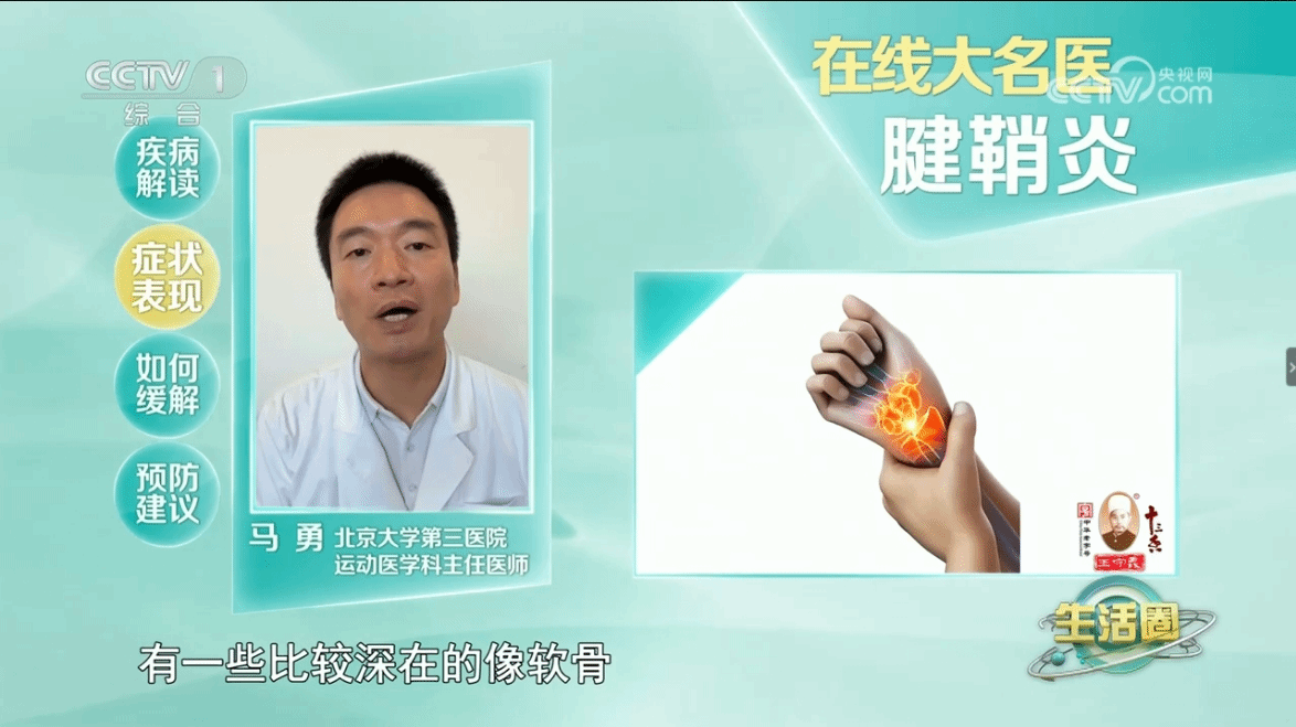 ——【CCTV1】3 月 21 日《生活圈》栏目,运动医学科马勇医生科普腱鞘炎相关疾病知识及如何预防。链接地址:https://tv.cctv.com/2024/03/21/VIDEP4JPmCLLGu4usDNIAfKZ240321.shtml