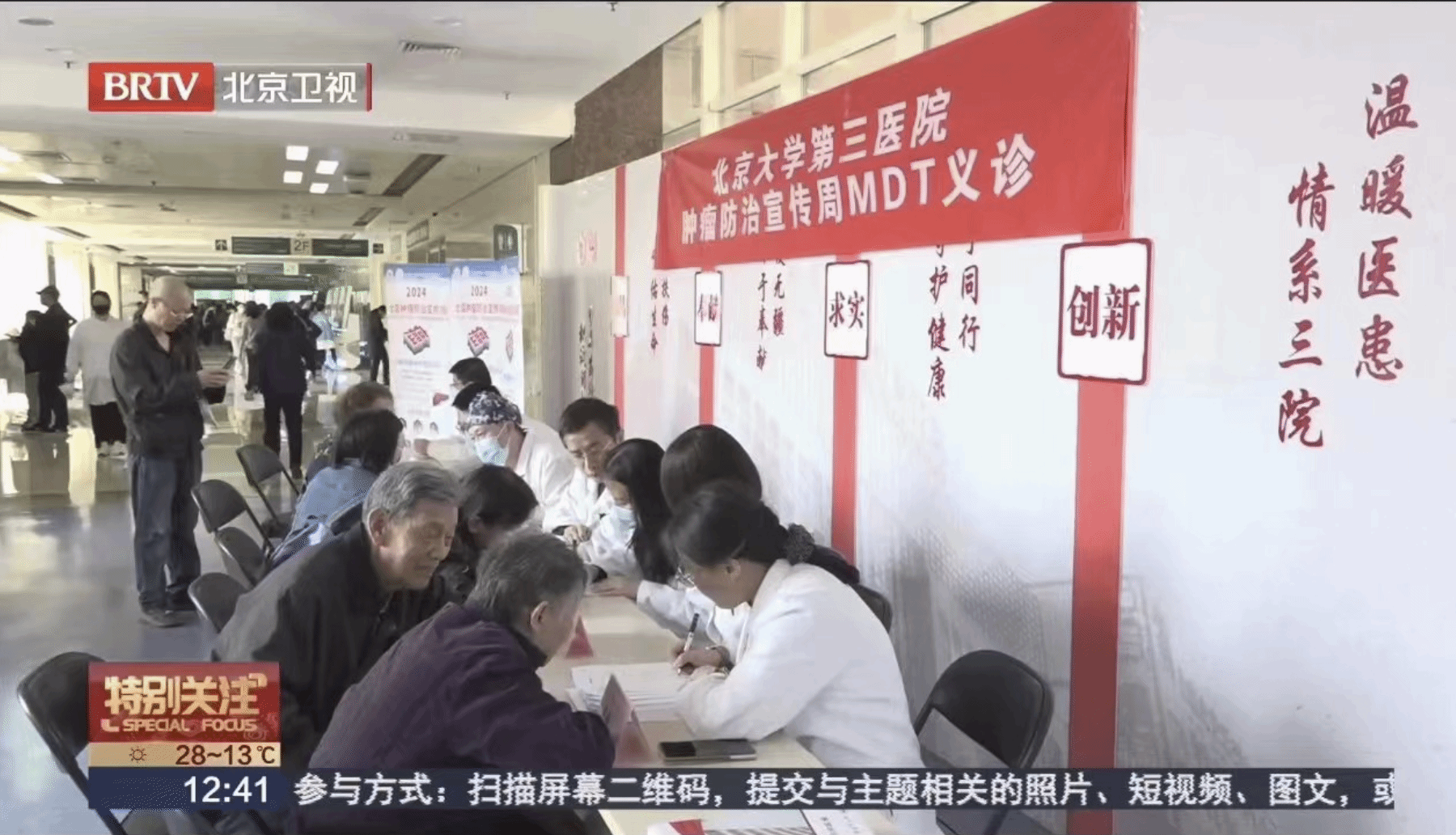 ——【CCTV13】4 月 17 日《朝闻天下》,全国肿瘤防治宣传周,肿瘤中心组织多场肿瘤 MDT 团队义诊,中央电视台《朝闻天下》栏目进行了6 期系列报道。院长、肿瘤中心主任付卫和普通外科孙涛、周鑫医生接受采访时,介绍了北医三院 MDT 诊疗模式,结直肠癌如何做到早发现、早诊断,结直肠癌筛查诊断怎么查,挂哪个科,并建议体检、肠镜、肿瘤分期评价应按需就诊,确诊为结直肠癌需明确肿瘤分期。 链接地址:https://tv.cctv.cn/2024/04/...