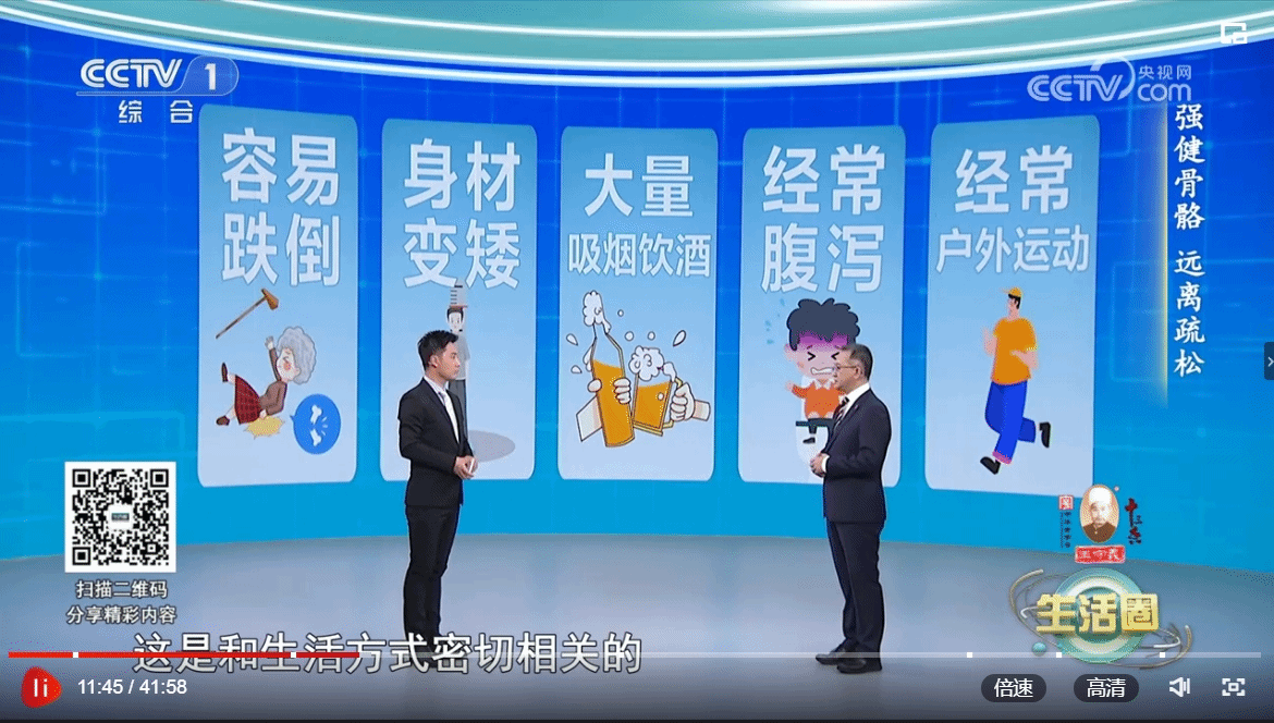 ——【CCTV1】6月7日《生活圈》栏目,骨科宋纯理、妇产科王威医生科普骨质疏松相关知识。链接地址:https://tv.cctv.com/2024/06/07/VIDEwSjEU7mLrUfI87AvyEBm240607.shtml