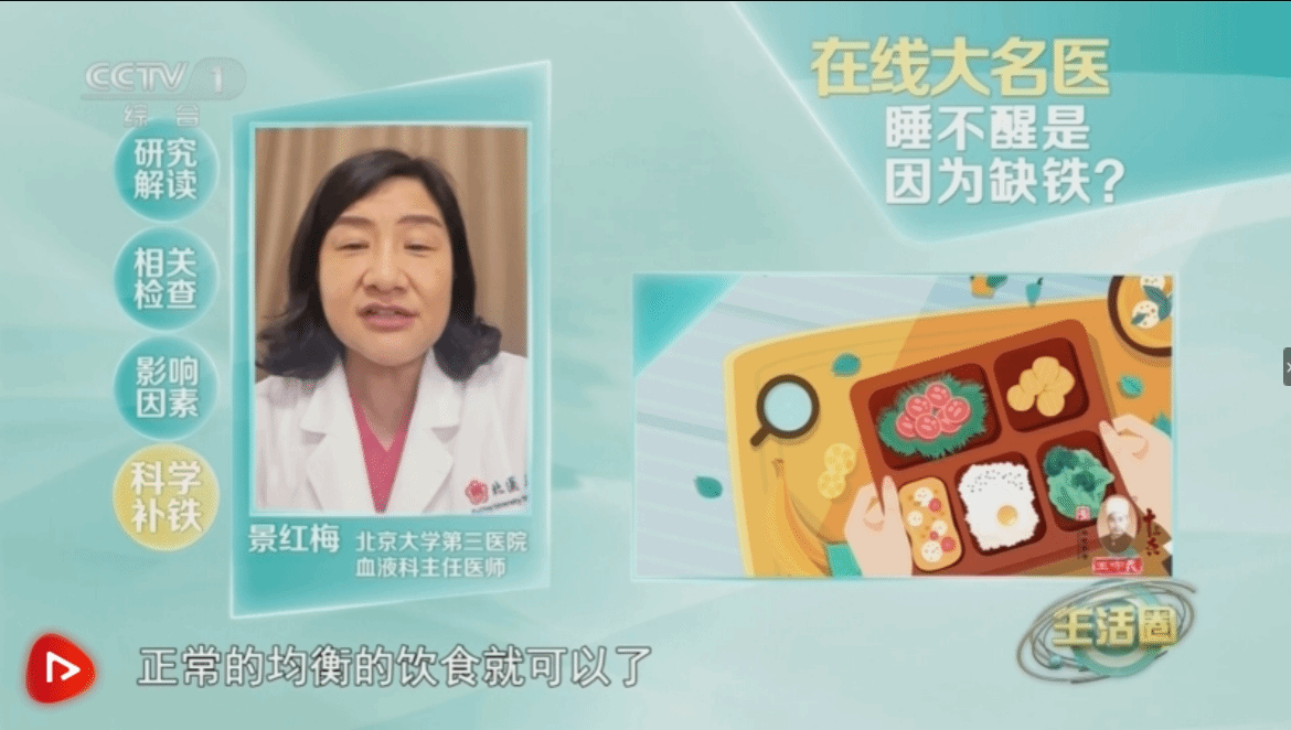 ——【CCTV1】6 月 25 日《生活圈》,血液内科景红梅医生科普人体缺铁相关知识。链接地址:https://tv.cctv.cn/2024/06/25/VIDEO0KCRkynzmDC5usA4DUZ240625.shtml