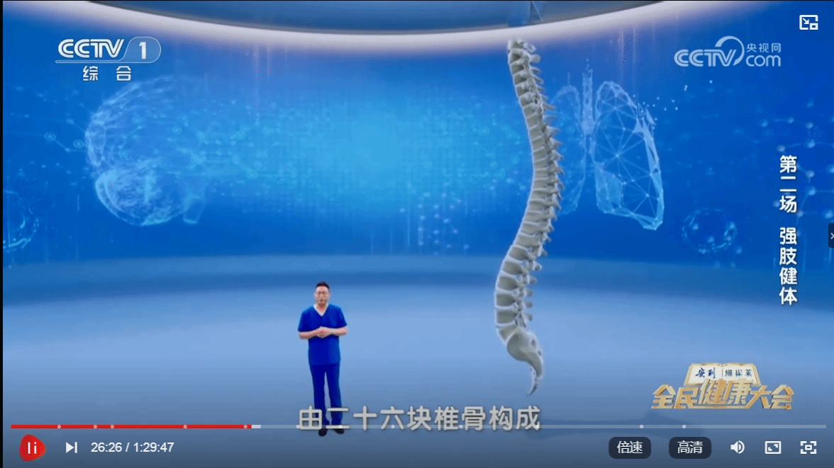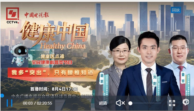 ——【CCTV4】《健康中国》8 月 4 日,骨科姜宇医生直播,科普腰椎间盘突出相关知识。链接地址:https://zhibo.sina.com.cn/mt/724852