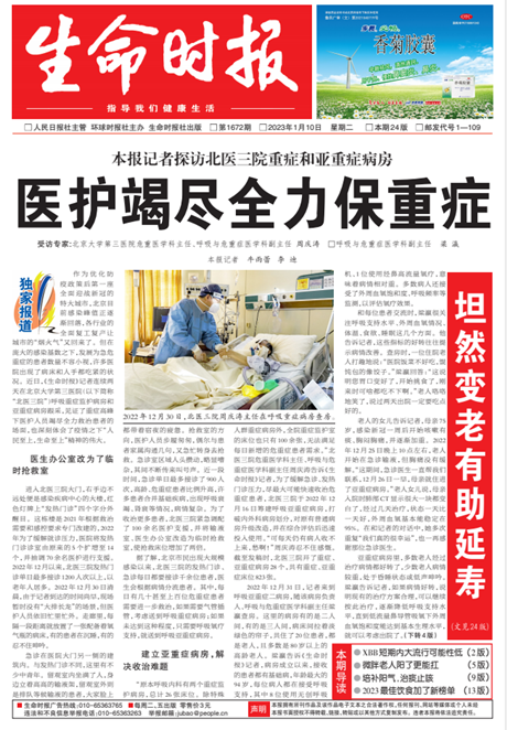 ——(2023年1月10日《健康报》) 当前,我国疫情防控进入新阶段,工作重心从“防感染”转向“保健康、防重症”。北京大学第三医院举全院之力,扎实有力做好重症救治工作。目前,医院已经成立呼吸重症、亚重症病房28个...