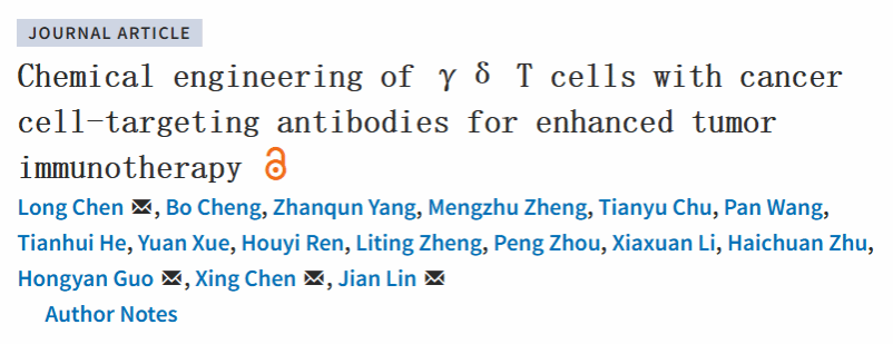 近日,北京大学第三医院药学部林坚研究员/陈龙副研究员团队联合妇产科和北京大学化学与分子工程学院团队在国际知名综合性期刊National Science Review上发表题为“Chemical engineering of γδ T cells with cancer cell-targeting antibodies for enhanced tumor immunotherapy”(肿瘤靶向抗体化学工程改造γδ T细胞赋能抗肿瘤免疫治疗)的研究论文,首次报道了一种通过化学工程策略构建抗体-γδ T细胞偶联物,显著提升γδ T细胞肿瘤靶向效率与抗肿瘤活性的新方法。...