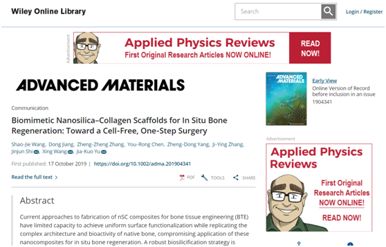 2019年10月17日,北京大学第三医院运动医学研究所余家阔教授团队在 Advanced Materials (IF 25.809)发表题为“Biomimetic nanosilica- collagen scaffolds for in situ bone regeneration: towards a cell-free, o...