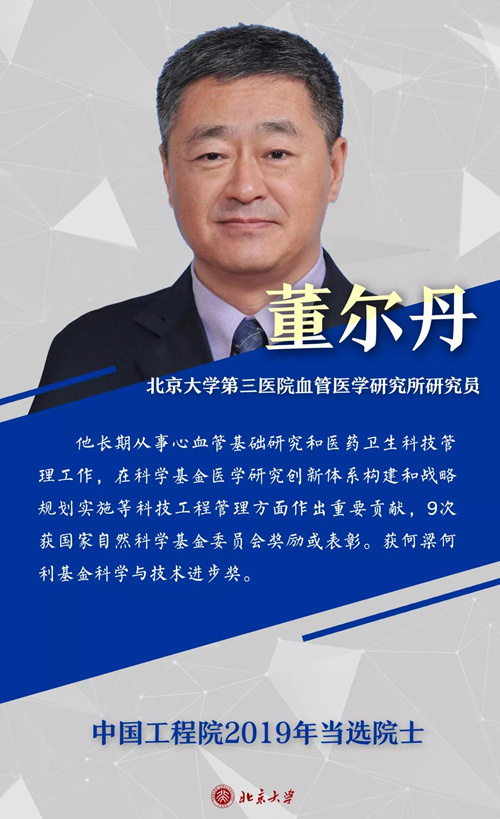2019年11月22日,中国工程院2019年院士增选结果揭晓,共选举产生75位院士。其中,北京大学第三医院血管医学研究所董尔丹研究员增选为中国工程院院士。 链接:中国工程院2019年院士增选结果 董尔丹简介 董尔丹,198...