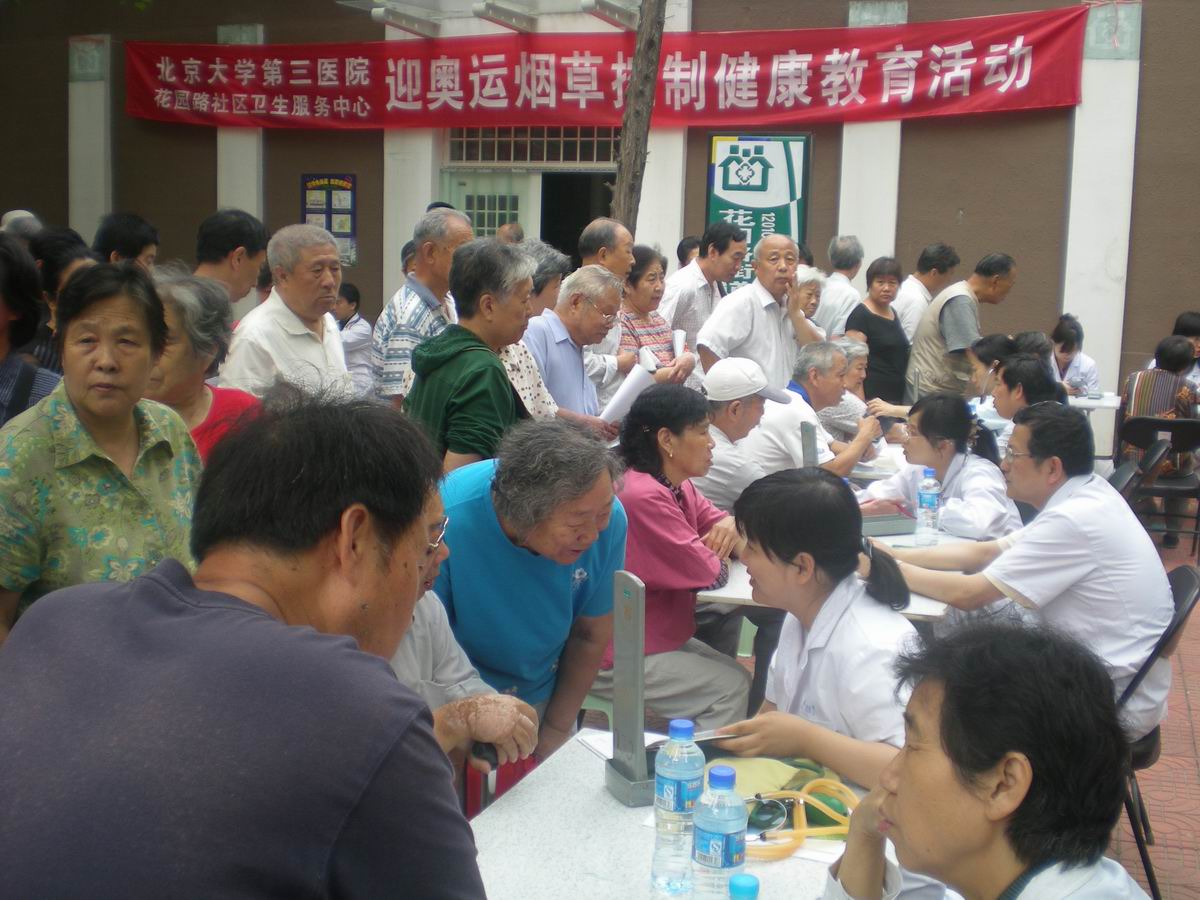 活动在社区居委会的协助下顺利展开。本次活动主题为“迎奥运,控制烟草健康宣教”,内容包括专家义诊、免费为社区居民测量血压和肺功能、发放戒烟宣传材料,对居民进行健康知识宣传。