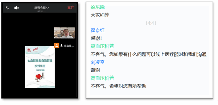为扩大高血压科普受众人群,同时采用腾讯会议形式,由心血管专科护士徐东晓老师进行《高血压科普讲堂》,对患者及家属进行科普讲座,普及高血压相关知识,指导患者及家属掌握自我管理的方法。