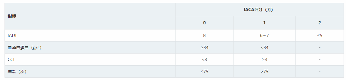 CGA常用的功能评估量表有日常生活活动能力(Activities of daily living,ADL)、工具性日常生活活动能力(Instrumental activities of daily living,IADL)及评估合并症的量表Charlson指数(CCI)或改良老年疾病累计评分表(MCIRS-G)。ADL评估洗澡、穿衣、如厕、移动、进食和大小便控制等能力,每项得分1分,总分6分;IADL评估财务管理、使用交通工具、采购、日常家务、沟通和服用药物等能力,每项1分,总分8分。目前较成熟的CGA体系有:①意大利淋巴瘤基金会(Lymphoma Italian Foundation,FIL)提出的老年综合评估(FIL-CGA),该体系以年龄、ADL、IADL和MCIRS-G为评估参数,将老年患者分为适合化疗组,不适合化疗组和脆弱组 ;2021年其更新了评估标准,提出简化CGA体系(sGA)。②日本淋巴瘤治疗学会(Society of lymphoma treatment in Japan)提出ACA指数(Age, Comorbidities, and Albumin index),该体系以年龄、血清白蛋白、CCI为评估参数,年龄≥75岁、血清白蛋白<0.37 g/L、CCI≥3三个指标各积1分,将老年患者分为预后良好(0分)、预后较好(1分)、预后中等(2分)、预后差(3分)4个亚组。③北京医院2018年对ACA指数进行了优化,将IADL加入评估体系,提出IACA指数,评价指标包括:年龄、IADL、CCI、血清白蛋白。④其他:老年评估8项(G8)、虚弱老年人筛查(VES-13)等,国内应用资料较少。目前尚无随机对照研究证实何种评估体系更适合老年DLBCL患者评估及指导分层治疗,建议开展相关研究。国内常用的CGA体系为:FIL-CGA、sGA和IACA指数,具体评分标准见表1,表2,表3。