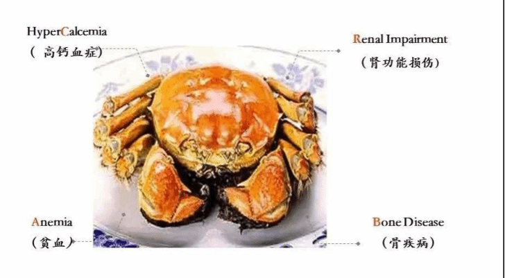 得这种肿瘤的病人可能因为高钙血症(HyperCalcemia)导致的神志障碍在神经科被发现,还有人是因为肾功能不好(Renal Impairment)在肾科被发现,也可能是因为贫血(Anemia)在血液科被发现,另外还有一部分人是因为骨折、骨痛(Bone Disease)在骨科确诊,而Crab组成的单词也可以被翻译成螃蟹,这四个表现也是这种疾病患者最主要的临床表现了。