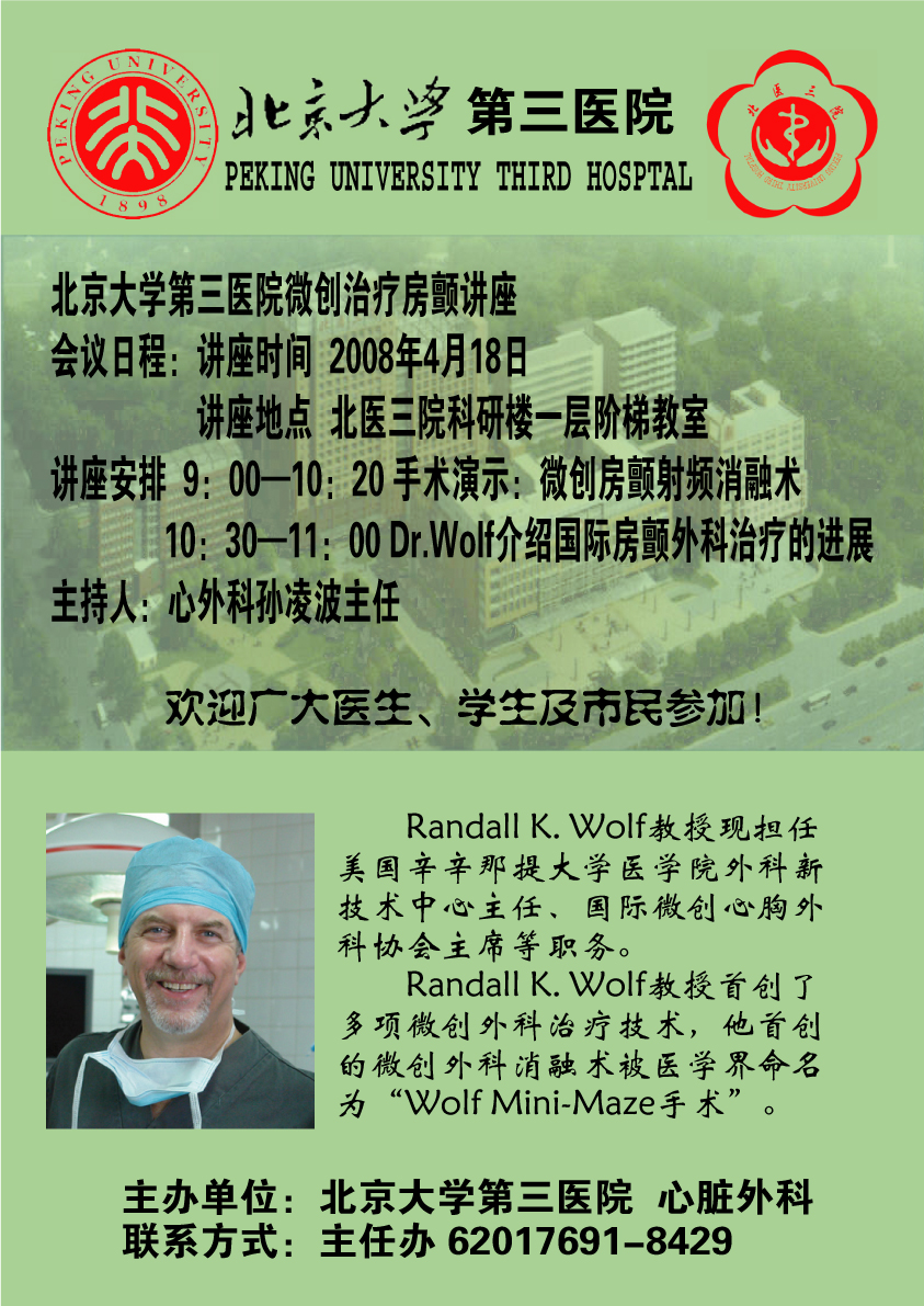 我院心脏外科拟于2008年4月18日邀请美国Randall K.Wolf教授举办微创治疗房颤讲座,介绍国际房颤外科治疗新进展,并进行手术演示。