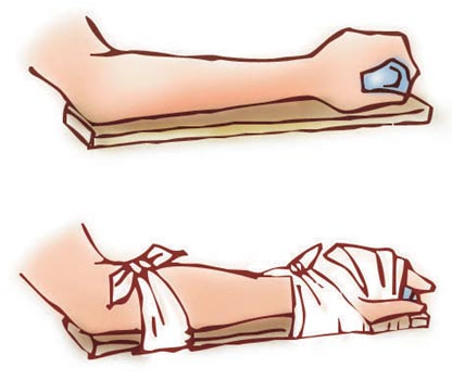 2.固定:用夹板固定受伤部位,或者用布条、绷带包裹、固定伤处。
