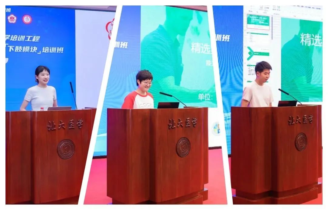 精选案例分享讨论环节,来自北医三院王琪(左)在髋关节病例中,详细说明了康复时期的注意事项及训练强度的选择,同时针对沉降动作进行了现场实操教学;无锡九院应秋雯(中)对膝关节髌骨骨折后的康复进程分享,引起了学员们的思维发散,充分梳理膝关节功能重塑期膝关节后方疼痛的因素及诊疗逻辑;郑州七院黄炎(右)分享的踝关节的病例,通过一例跟腱术后患者的经验,将腱病类问题的诊疗思路详细剖析,并根据最新的文献指南,探讨了治疗肌腱腱病的有效策略。