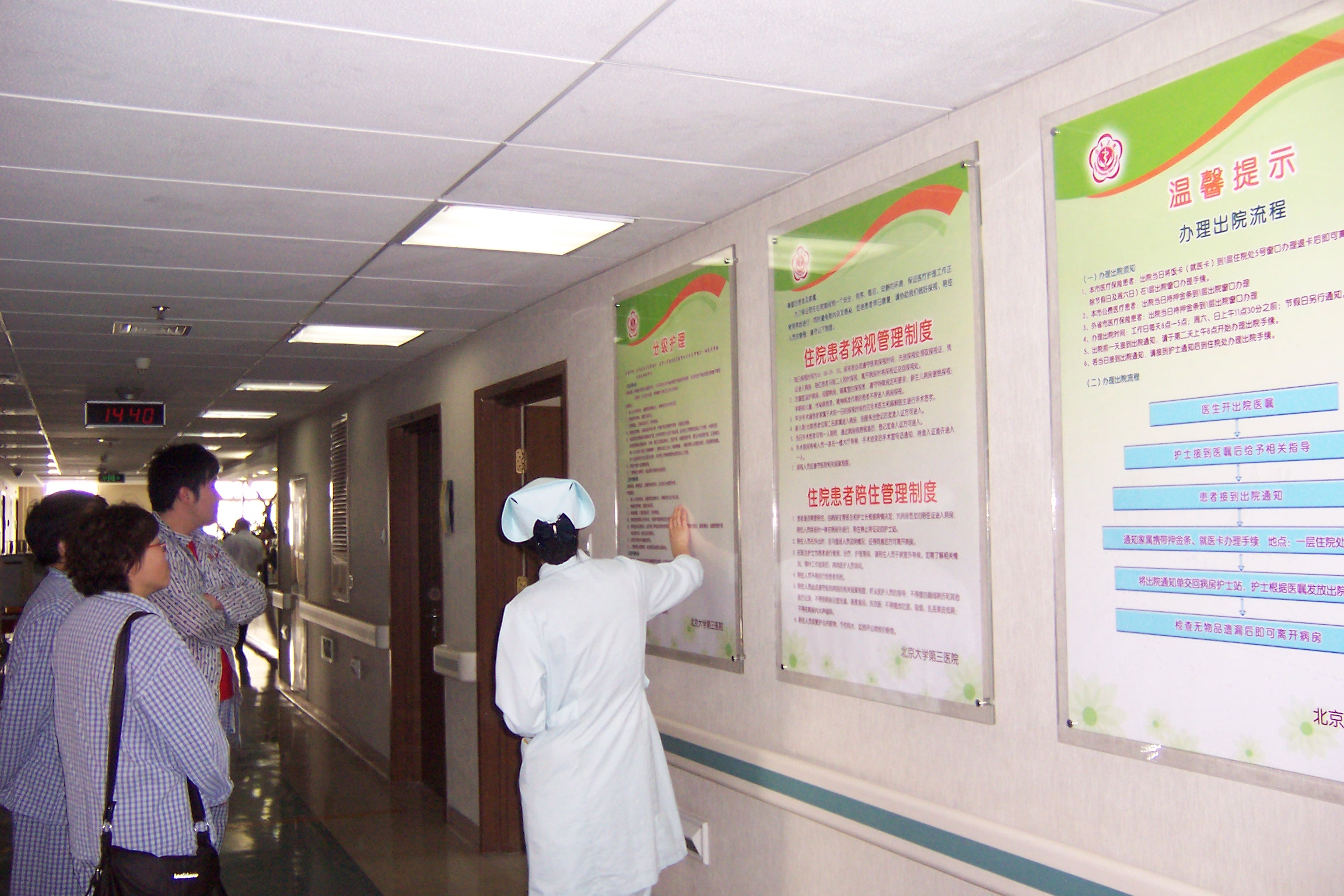 A:⑴入院后请您不要随意离开病房,如有特殊检查一定要通知护士得到允许后方可离去,如不遵守规定私自外出一经发现,将立即处理劝其出院。