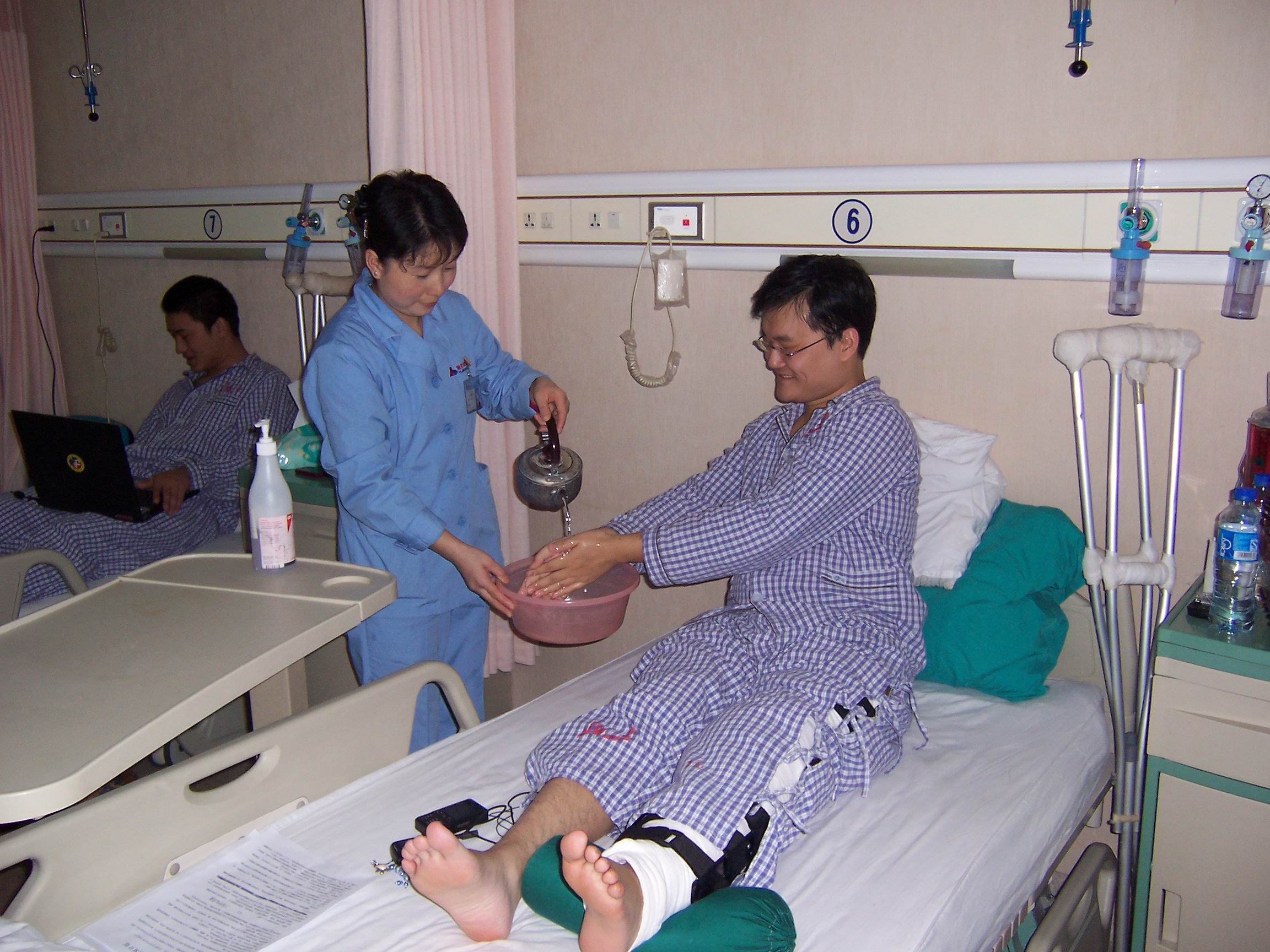 A:运动医学病房主要包括普通病房为三人间或五人间,高等病房为单间。每个病房内均配有独立的卫生间;每个病房内设有线电视一台。走廊的尽头是活动室,配有微波炉和电冰箱,供患者使用。