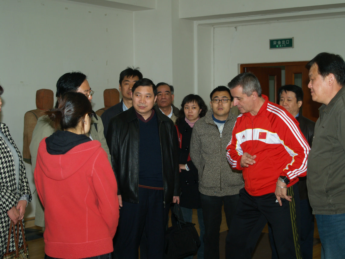 而更特别的是,在每幅书法的内容都被翻译成法语,工整的写在中文的下方,这是我们在疑惑的同时,不约而同的将注意力转移到赛场上身穿国家队训练服的“洋教头”身上,他就是2006年受聘国家男女佩剑队总教练的法国人鲍埃尔。他也看到了我们一行人,他清楚了我们的身份和此行目的,非常欢迎我们的到来,并马上把一名运动员叫到身边,请党支部的几位专家诊治他的伤情,这位运动员正是奥运会男子佩剑冠军仲满。研究所几位专家为仲满做了认真细致的检查,得知他的伤情并无大碍并且可以通过保守治疗得到缓解,鲍埃尔和仲满非常高兴。之后他又向我们咨询了击剑中常发生于肩关节、膝关节和腕关节的一些伤病的处理,而我们也向洋教练请教了击剑运动中常见的一些关节和韧带的损伤机制,这对于我们在临床工作中判定病情,选择恰当的治疗手段很有帮助。就在训练场边的这次卓有成效的交谈,使双方都获益匪浅。